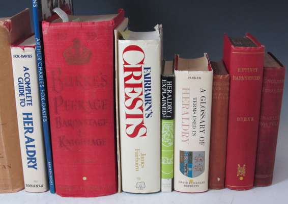 Armorial families, a directory of gentlemen of coat-armour. London, 1910. Sixth edition, 4to, colour plates, original brown cloth gilt, upper hinge tape repaired, lower hinge splitting; [Idem] The book of public arms. London, 1915. New edition, 4to, frontispiece, plates, original green cloth gilt, rubbed, bookplate; [Idem] Heraldic badges. London, 1907. 8vo, frontispiece, original red cloth gilt, backstrip faded, bookplate; Burke, John Bernard A genealogical and heraldic history of the extinct and dormant baronetcies of England, Ireland and Scotland. London, 1844. Second edition, 8vo, original red cloth gilt, corners bumped; and 9 others on peerages and heraldry (13)