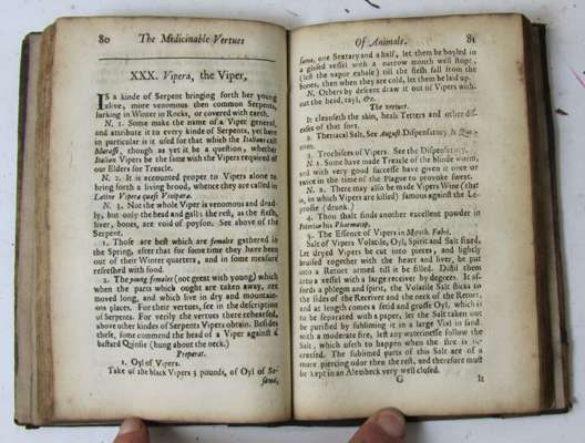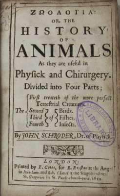 Zoologia [Greek], or the history of animals as they are useful in physick and chirurgery. London: R. Royston, 1659. First English edition, translated by T. Bateson, 8vo, viii [including blank leaf A1-2], 159, 8; contemporary calf, some spotting, upper margin slightly dampstained
