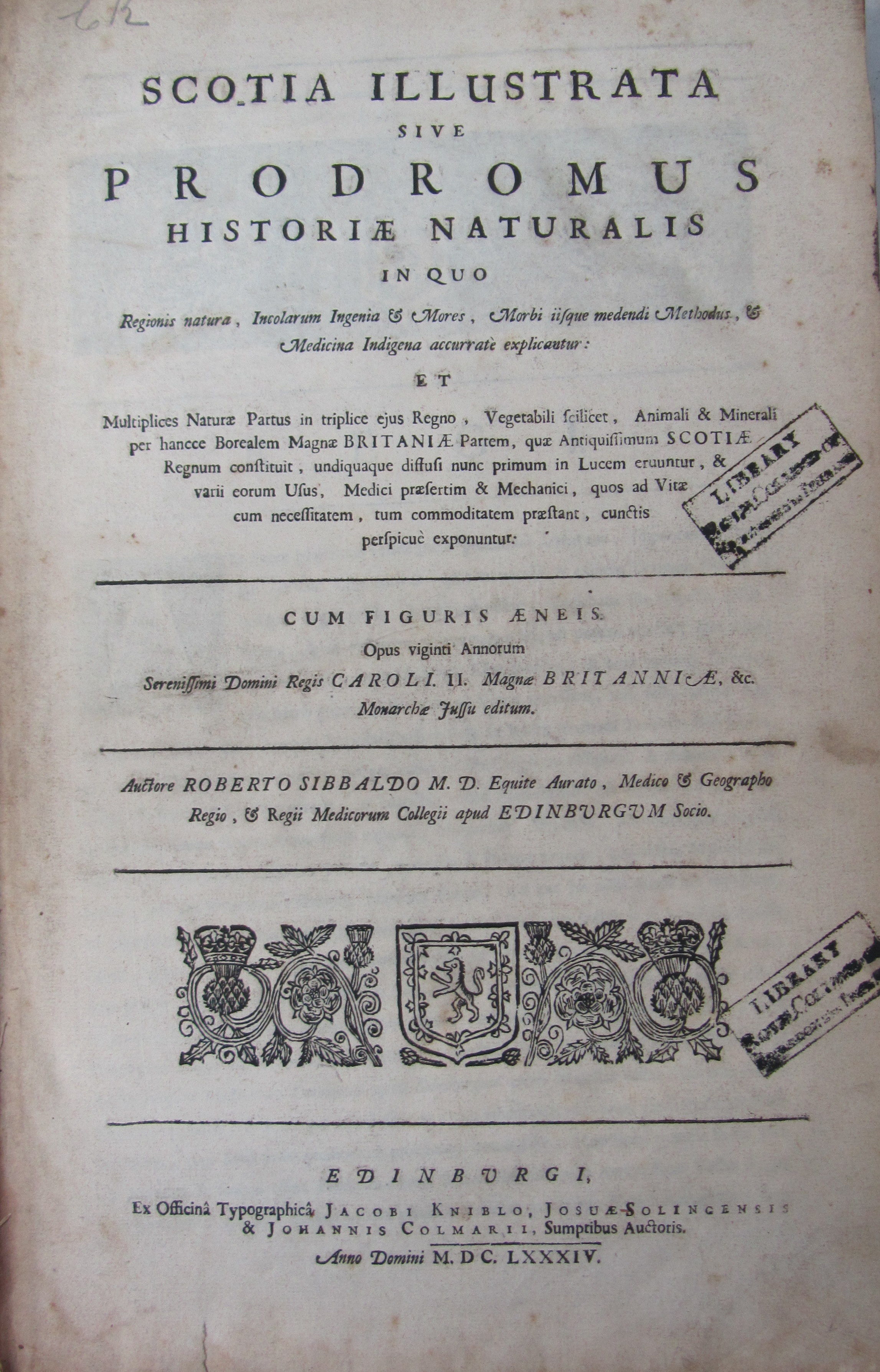 Scotia illustrata, sive prodromus historiae naturalis. Edinburgh: J. Kniblo, et al, 1684. First edition, folio, 4 parts in one volume, armorial frontispiece, 22 plates, contemporary panelled calf, worn, boards loose, backstrip perished, dustmarking throughout