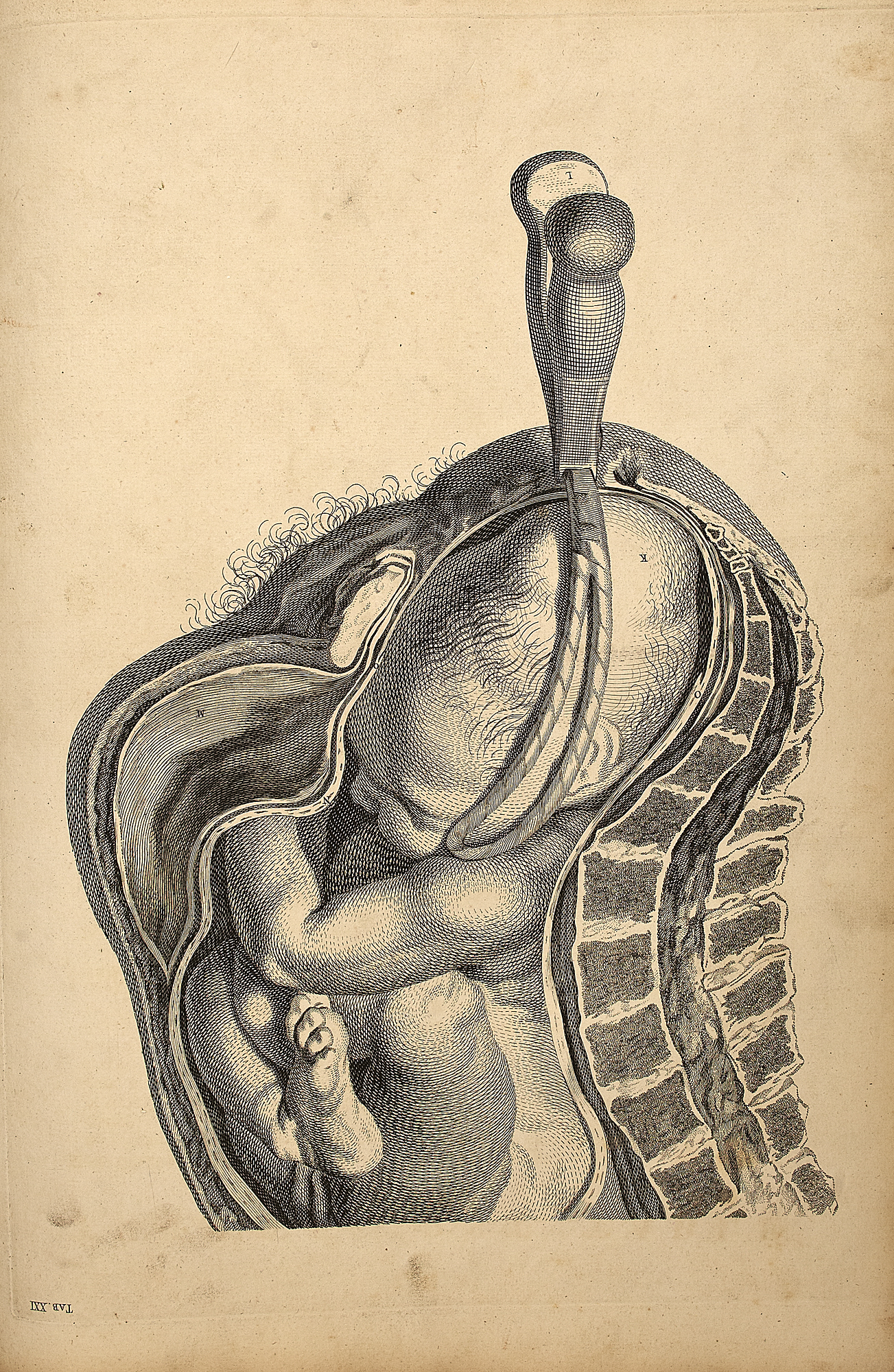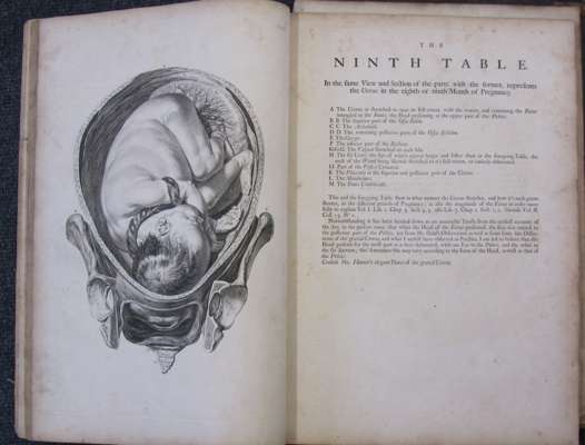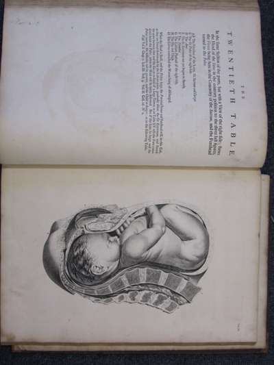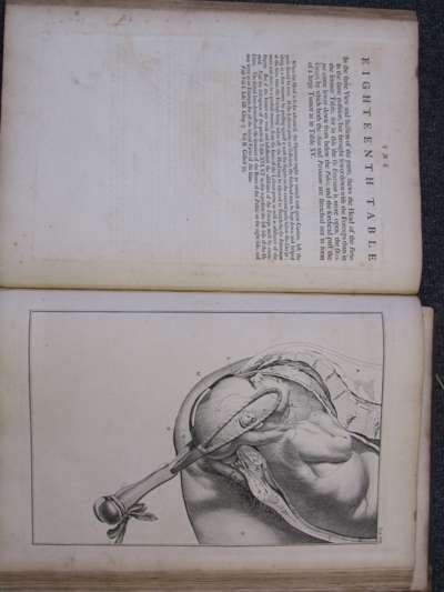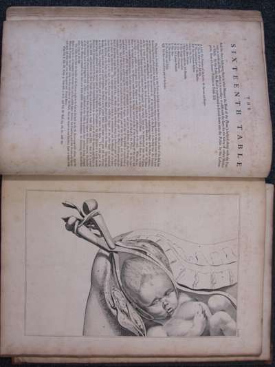 A sett of anatomical tables, with explanations, and an abridgment of the practice of midwifery. London, 1754. First edition, large folio, 38 (of 39) engraved plates (lacking plate 4), each plate with accompanying leaf of text, 39th leaf laid down (not affecting text), contemporary calf, some light soiling and spotting, worn, cover detached, 7cm tear to one plate without loss