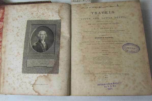 Travels in upper and lower Egypt. London, 1800. 4to, folding map, plates, spotted, dampstained and browned, lacking lower cover; [Idem] Travels in Greece and Turkey. London: T.N. Longman, 1801. 4to, contemporary half calf, lacking maps and plates, spotted, lacks spine, covers detached; Kinneir, J.M. A geographical memoir of the Persian empire. London: J. Murray, 1813. 4to, original boards, lacking the 2 maps, spotted and soiled, marginal browning, worn, lacking spine, covers detached (3)