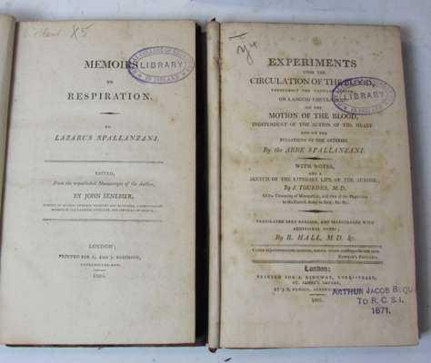Experiments upon the circulation of the blood. London: J. Ridgway, 1801. 8vo, contemporary half calf, some spotting, upper cover detached; [Idem] Dissertations relative to the natural history of animals and vegetables. London: J. Murray, 1784. 2 volumes, 8vo, 3 folding engraved plates, contemporary calf, some spotting, marginal dampstaining in vol. 2, three covers detached; [Idem] Memoirs on respiration, edited by John Senebier, half-title, contemporary half calf, upper board detached; [Idem] Nouvelles recherches sur les découvertes microscopiques. London & Paris: Lacombe, 1769. 2 volumes in one, 8vo, 9 engraved plates, several folding, errata leaves, contemporary calf, some dampstaining and spotting, rubbed; and Spallanzani's Travels in the Two Sicilies (9)
