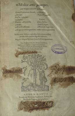 Medicae artis principes, post Hippocratem & Galenum.... [Geneva]: H. Estienne, 1567. Folio, 5 parts in one volume, *4 a-z6 aa-mm6 AAA-ZZZ6 AAAa-FFFf6 AAAAa-ZZZZz6 AAAAaa-NNNNnn6 OOOOoo4 aaa-zzz8 aaaa-cccc8 dddd6 AAa-TTt6 a-?6, lacking signatures eta-iota6 [last 18 leaves], woodcuts, printer's device on title, library stamp, previous ink signatures to title smeared, ink stains to edges, waterstains to lower edges, calf worn, boards loose; [Idem] Medicae artis principes, post Hippocratem & Galenum.... [Geneva]: H. Estienne, 1567. Folio, 3 parts in one volumes, *4