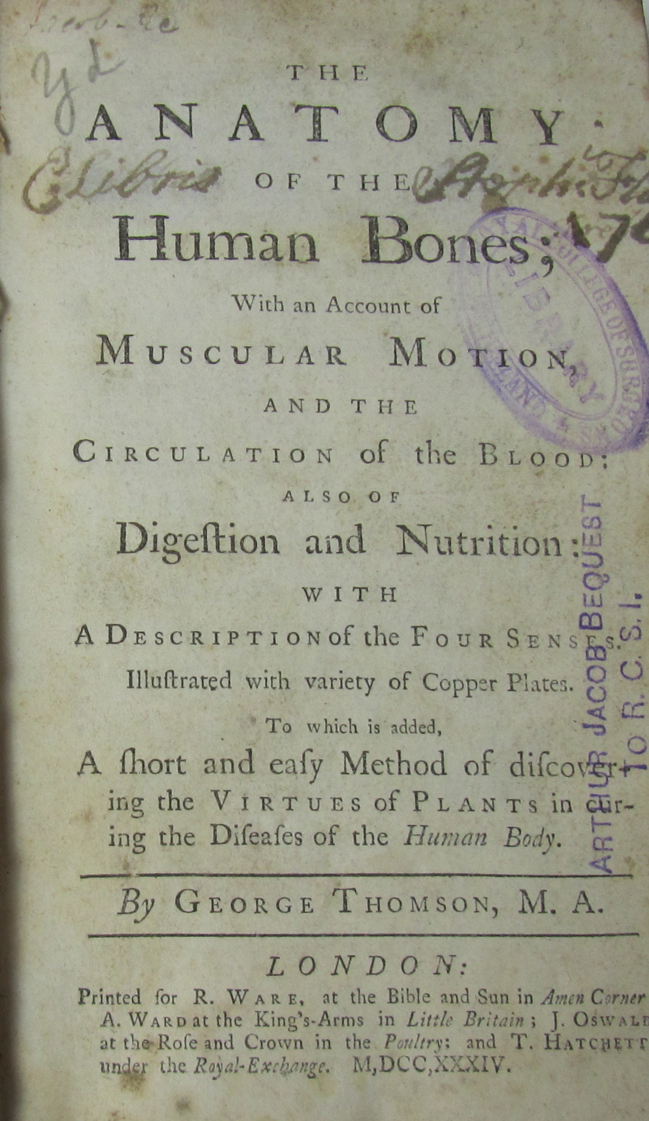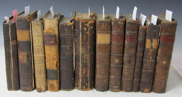 The anatomy of the human bones. 1734. 8vo, 15 folding engraved plates, contemporary calf, worn, cover detached; Smellie, W. Thesaurus medicus. Edinburgh, 1778-85. 4 volumes, 8vo, folding engraved plates, contemporary quarter calf, some dampstaining, rubbed; [Anatomy] An essay on comparative anatomy. 1775. 8vo, contemporary calf, rubbed; Fothergill, J. A complete collection of the medical and philosophical works. 1782. 8vo, calf, textblock split, cover detached; Whyte, R. Observations on the nature, causes and cure of those disorders. Edinburgh, 1765. 8vo, contemporary calf, dampstained, upper cover detached; Wall, John Medical tracts. Oxford, 1780. 8vo, contemporary calf, worn, covers detached; Chamberlayne, J. The religious philosopher. 1719. 8vo, volume 2 only, folding plates, contemporary calf, worn, upper cover detached; Memoirs of the Medical Society. 1795. Volume 4 only, folding plates, calf, dampstained, upper cover detached; and Volume 2 on the Medical Museum, calf, textblock split, lacks title, worn (11)