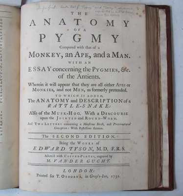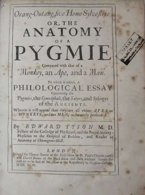 First edition of the Tyson's ground breaking work on comparative morphology. An anatomical study of the orang-outang (actually a young chimpanzee) was the first to demonstrate scientifically the structural relationships between man and anthropoid ape.