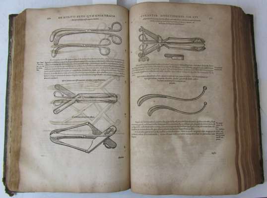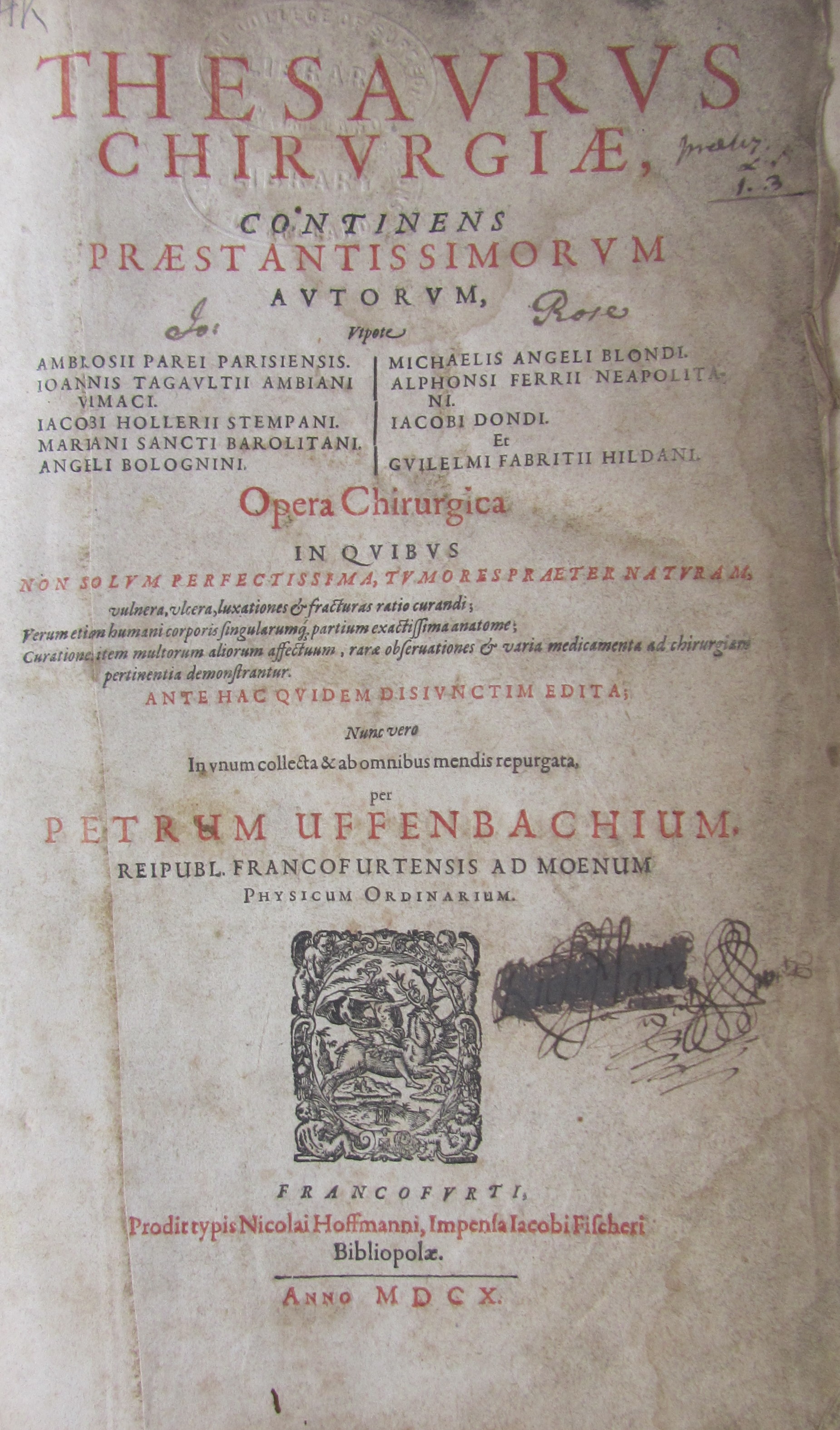 Thesaurus chirurgiae... Frankfurt: N. Hoffman, 1610. Folio, [12] 1164 [28], printer's device on title, woodcuts in text, portrait, soiled and browned throughout, worming to lower margin, library stamps, previous ink inscripition scored through on title, later half calf, worn, hinges splitting