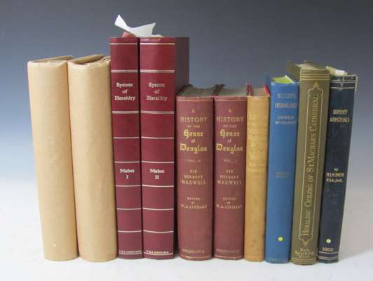 The arms of the baronial and police burghs of Scotland. Edinburgh, 1903. 4to, 2 volumes, one of 315 copies, half titles, contemporary cloth gilt, Faculty of Procurators Glasgow gilt stamp to upper boards, interior clean, bookplates; Nisbet, Alexander A system of heraldry. Edinburgh, 1984. Facsimile edition, 4to, 2 volumes, modern boards; Maxwell, Sir Herbert A history of the house of Douglas. London, 1902. 8vo, 2 volumes, frontispiece to each volume, plates, original burgandy cloth gilt, fading to backstrips, foxing; Balfour Paul, Sir James Heraldry in relation to Scottish history and art. Edinburgh, 1900. 8vo, frontispiece, plates, original cloth gilt, backstrip discoloured, foxing to endpapers, bookplate of Norman Lamont of Knockdow; Innes of Learney, Sir Thomas Scots heraldry. Edinburgh, 1956. Second edition, 8vo, frontispiece, plates, original blue cloth gilt, bookplates and cuttings to endpapers and half title; Geddes, W.D. & Duguid, P. Lacunar Basilicae Sancti Macarii Aberdonensis. Aberdeen: Spalding Club, 1888. 8vo, number 177 of 525 copies, frontispiece, plates, original green cloth gilt, foxing; Smith, H.L. Norton A collection of armorials of the county of Orkney. [No place], 1902. 8vo, one of 200 copies, colour frontispiece, illustrated by A.M. Traill, original cloth gilt, rubbed, frontispiece loose, bookplate; and 48 others on Scottish heraldry (58)