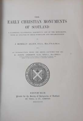 The early Christian monuments of Scotland. Edinburgh: printed for the Society of Antiquaries of Scotland, 1903. 4to, 3 vols in 2, modern half morocco gilt, with original decorative half morocco boards retained seperately, interior clean (3)