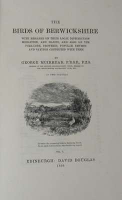 The birds of Berwickshire. Edinburgh: David Douglas, 1889. 8vo, 2 volumes, number 87 of 100 copies, original cloth gilt, t.e.g., backstrips discoloured, interiors clean; Ferguson, J. Notices of remains Pre-reformation churches in Berwickshire. Alnwick, 1890. 8vo, 5 plates, presentation copy from author, contemporary half calf gilt, rubbed at edges; Cardonnel, Adam de Picturesque antiquities of Scotland. London, 1788. 4to, half title, contemporary half red morocco gilt, some rubbing to boards, interior clean; [Rhind, W.] Sketches of the past and present state of Moray. Edinburgh, 1839. 8vo, presentation copy from the author, plates, contemporary cloth gilt, rebacked, replacement endpapers; and 7 others (12)
