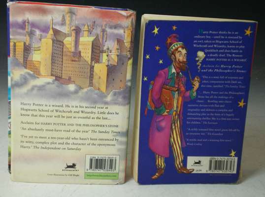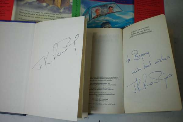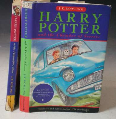 Harry Potter and the philosopher's stone. 19th impression, inscribed on dedication leaf "to Bryony, with best wishes, J.K. Rowling", original paperback, Smarties Gold Award Winner label to upper cover, split and slight wear to bottom of spine, slightly rubbed at extremities; Idem Harry Potter and the chamber of secrets. First edition, first impression, signed on front endpaper "J.K. Rowling", original cloth, dust-jacket very slightly frayed at corners and small tear at head of lower jacket (2)