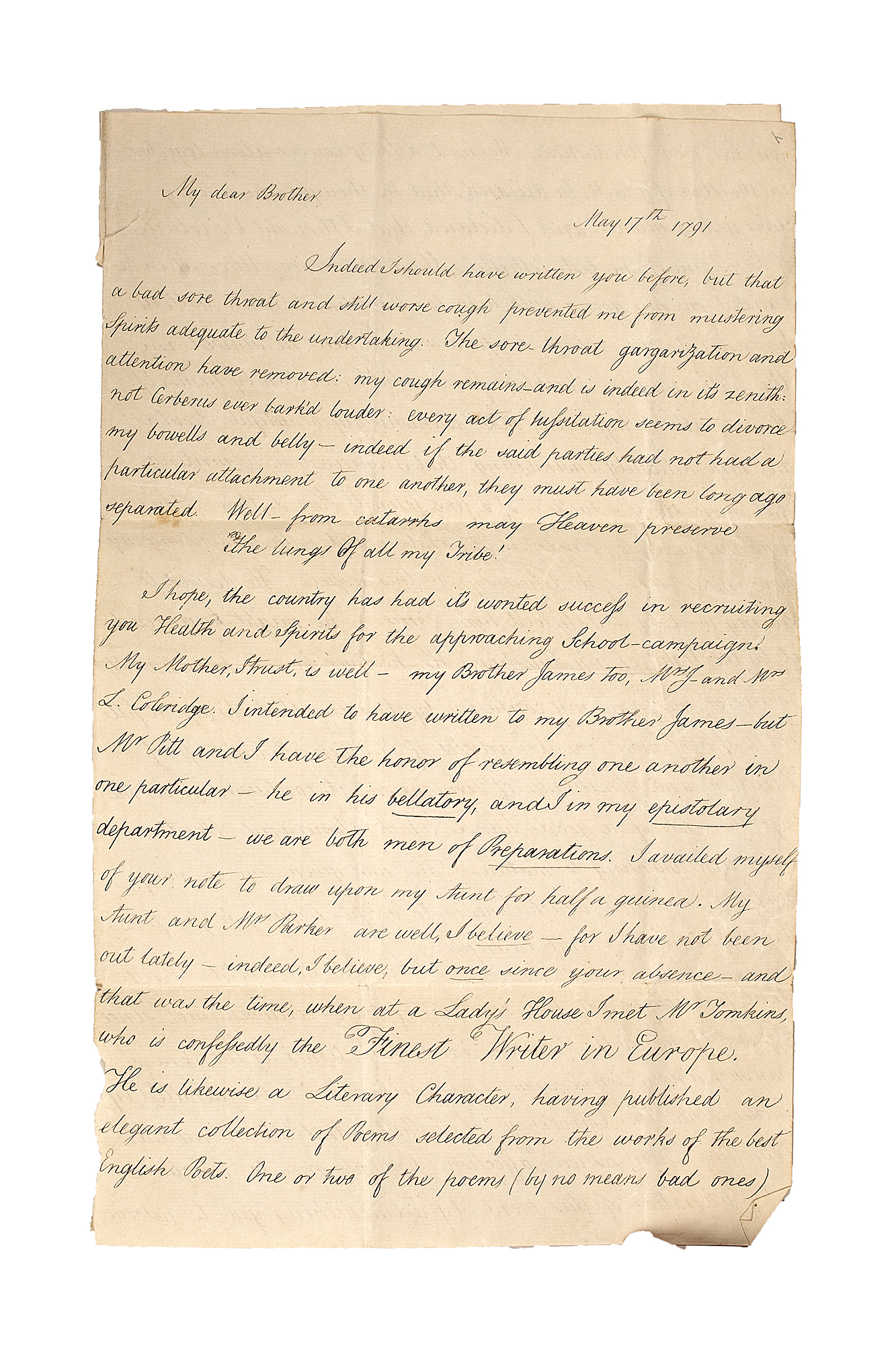 Autograph letter, to his brother George, about Calligraphy, incomplete, lacking most of the second leaf, written in Coleridge's neatest copperplate script, commenting on his cough, ",,,not Cerberus ever bark'd louder: every act of tussitation seems to divorce my bowells and belly...Well - from catarrhs may Heaven preserve / The lungs Of all my Tribe!..."; passing on family news, and commenting enthusiastically on his meeting with the writing master Thomas Tomkins (1743-1816), whose script he emulates in this letter, 2 pages, folio, and fragment of second page (small strip at top), 17 May 1791 "...he declared, that he thought me a very clever young man - and I declared that I thought his Collection of Poems one of the best Collections, I had ever seen...here he shewed me the Title-page of Macklin's famous bible, written by himself. It was, without hyperbole, most astonishingly beautiful. I could not help delicately insinuating that I conceived such writing not more the production of a fine-formed Hand, than the emanation of an elegant Soul; and I ended with lamenting my own most shameful deficiency in this respect. He desired to see my writing - I shewed him some - he might have read it by the light of my Blushes...it contained never the less the seeds of a good hand... I regard them as the causes, and that time as the Æra of my surprizing conversion - a conversion to be parrelleled by none since the conversion of St. Paul..."