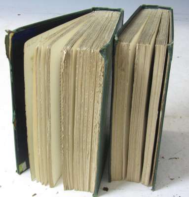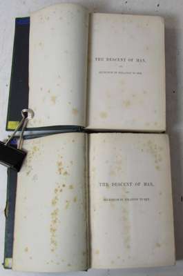 The descent of man. London: J. Murray, 1871. First edition, second issue, 2 volumes, 8vo, half-titles, illustrations, 16pp. advertisements dated Jan. 1871 at end of volume 1 and 2, original green cloth, some spotting, especially at end, some leaves carelessly opened, textblock split in two, extremities, edges and corners worn, without the Postcript leaf in volume 2, ink note to p. 189 volume 1