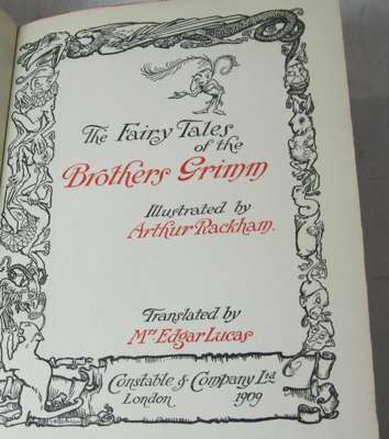 The fairy tales of the Brothers Grimm. London: Constable & Company, 1909. 8vo, 55 plates, later morocco backed cloth, original cloth bound in at rear, ink inscription on reverse of frontispiece