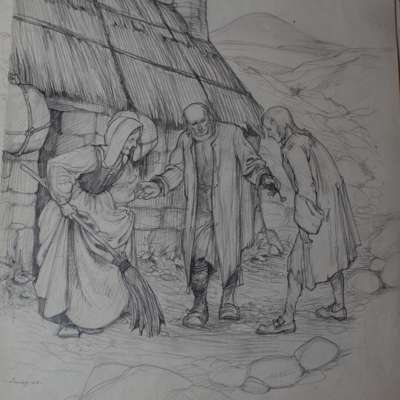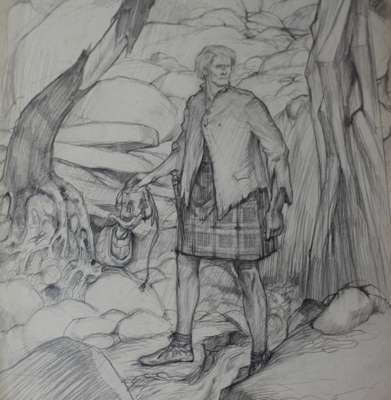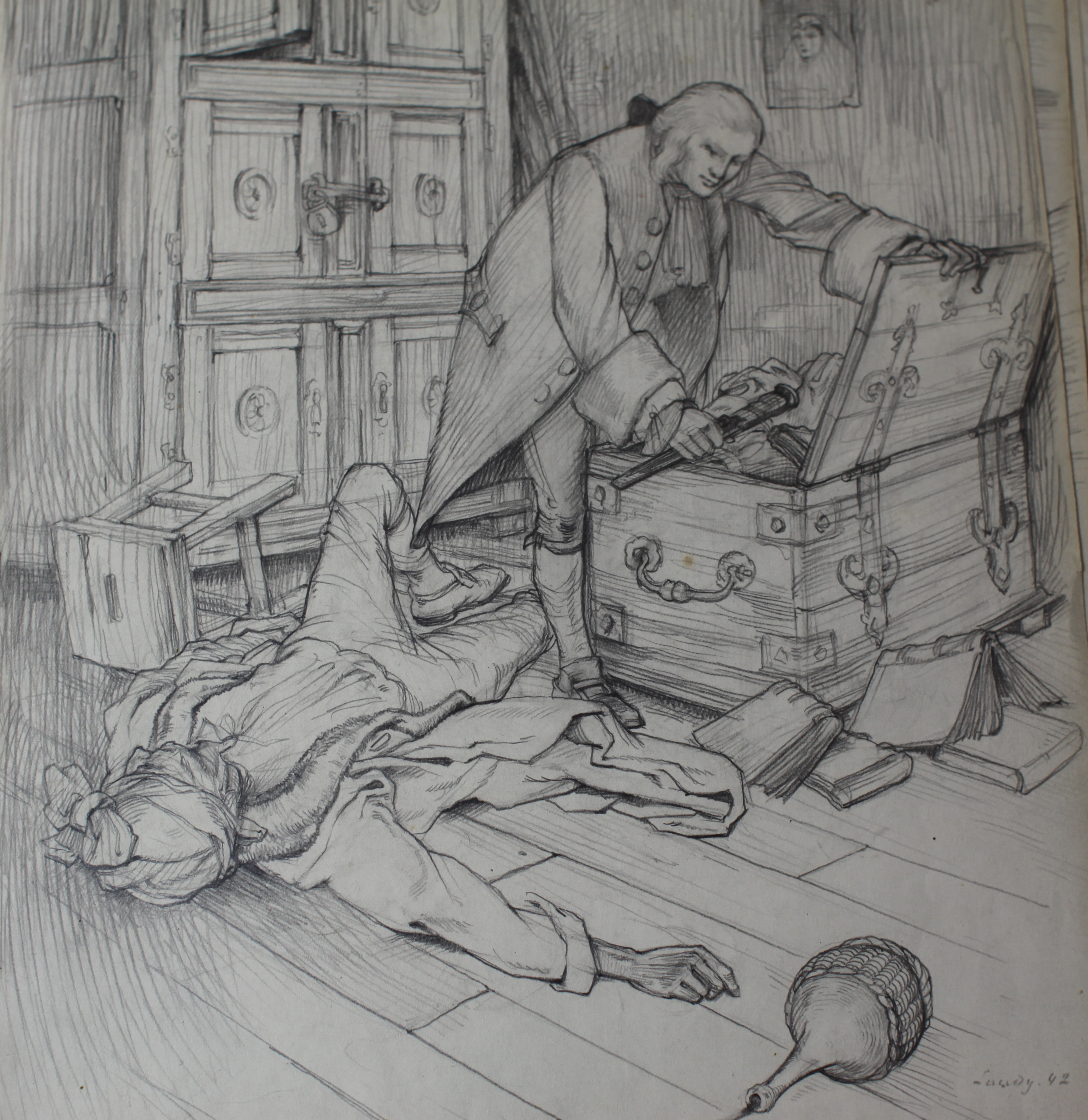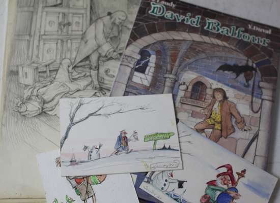 A collection of original illustrations, comprising; Fourteen pencil drawings, probably for Kidnapped, 34 by 22cm. (average), each signed 'Laudy 42'; one pencil and watercolour drawing, probably for Kidnapped , 34 by 22cm., signed 'Laudy 41', extremities slightly frayed; twenty-three original Christmas cards, 10.5 by 14cm. (average), mostly ink and watercolour, all signed 'Laudy' or 'Jack' and dated between 1959 and 1992; together with three prints and an inscribed copy of a 1980 comic book version of Kidnapped entitled David Balfour, some occasional light spotting and browning