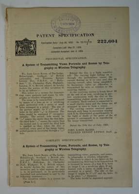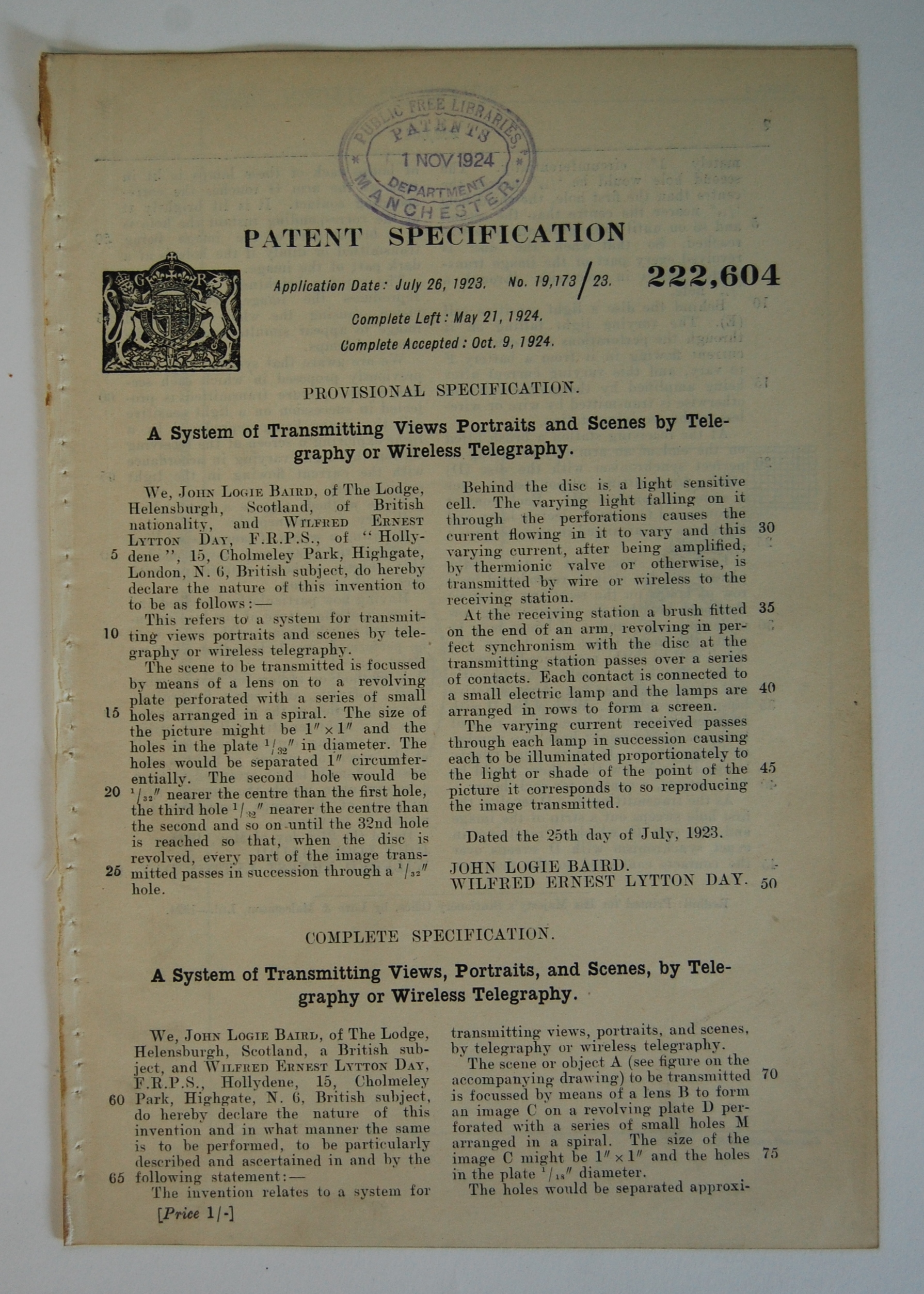 Patent specification - A system of transmitting views portraits and scenes by telegraphy or wireless telegraphy filed by John Logie Baird and WIlfred Ernest Lytton Day. London: July 1923 [complete accepted Oct. 1924], 8vo, text page and plan, disbound, stamp of Manchester Patents Dept to upper leaf
