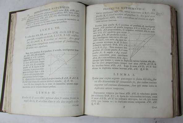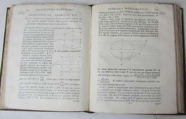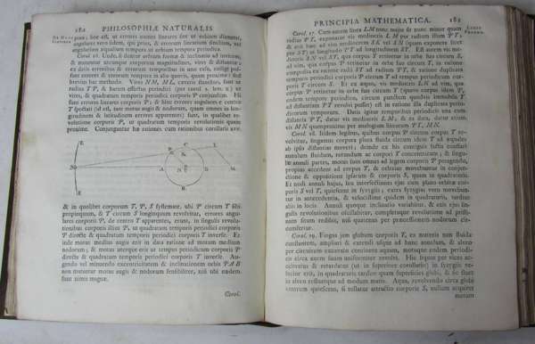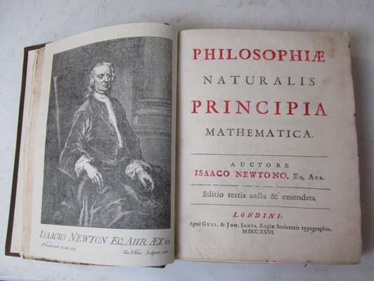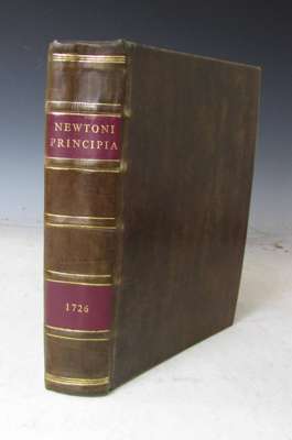 Philosophiae naturalis principa mathematica. London: W. & J. Innys, 1726. Third edition, 4to, title in red and black, half-title, Halley's verses, 2 pages publisher's advertisements at rear, engraved illustration of cometary orbit on p.506, woodcut diagrams throughout, modern calf, spine gilt, morocco lettering pieces, portrait and license leaf supplied in good facsimile, some light damp-staining to upper margin