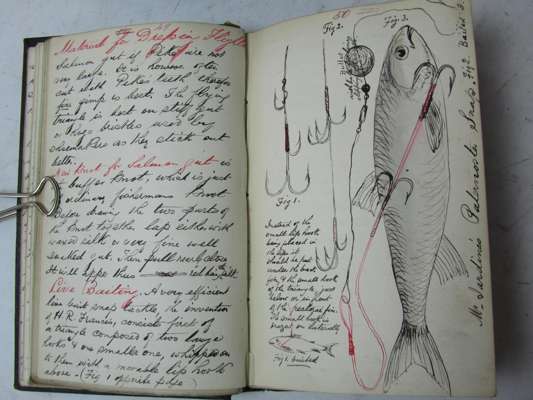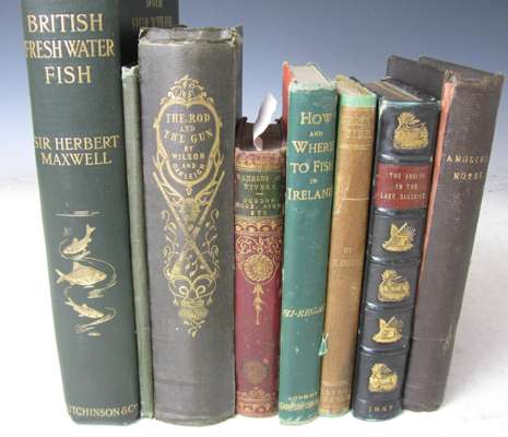 Autograph Manuscript "Notes on angling" by W.M Cormick, Kirkaldy, 168pp. + index, ink with watercolour illustrations of fish, hooks and flies, black ink with red ink titles and sub-titles, with notes on salmon fishing, trout flies, minnow fishing, rivers Cairn, Lochs Freig, Ossian, Sting, Ballo, salmon fishing on Tay &c., cloth binding, [c.1890]; Wilson, James The Rod and the gun. 1844. 8vo, frontispiece, illustrations, original cloth; Akerman, J.Y. Spring-tide or the angler and his friends. 1850. First edition, 12mo, frontispiece & 6 etched plates, original cloth, neatly rebacked retaining original spine; Hi-Regan How and where to fish in Ireland. 1887. 8vo, folding map, illustrations, original cloth, slightly rubbed; Davy, John The angler in the Lake District. 1857. First edition, 8vo, contemporary half calf, emblematically tooled in spines; Tayler, James Red Palmer: a practical treatise on fly fishing. 1888. 8vo, original cloth; Thorne, James Rambles by rivers. 1844. 12mo, wood-engravings, contemporary calf, slightly rubbed; Maxwell, Herbert British fresh-water fishes. 1904. 4to, plates, original cloth; and 1 other (9)