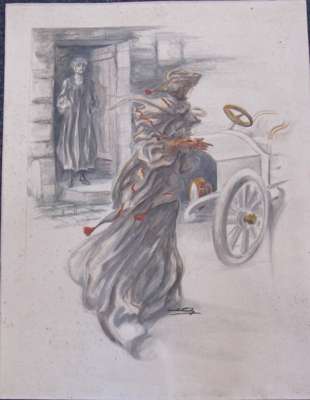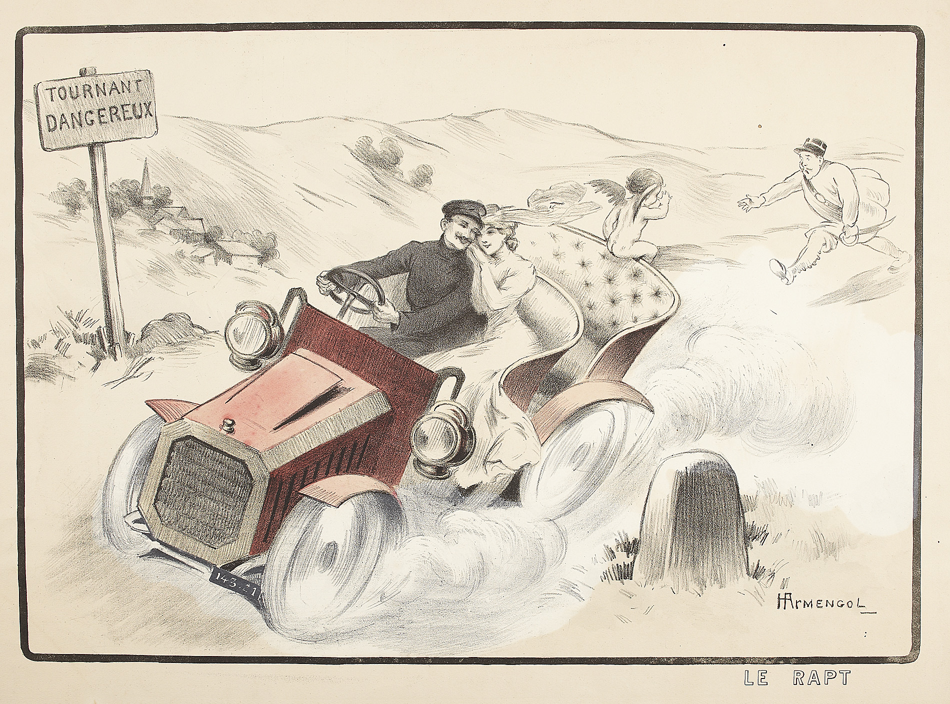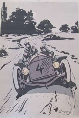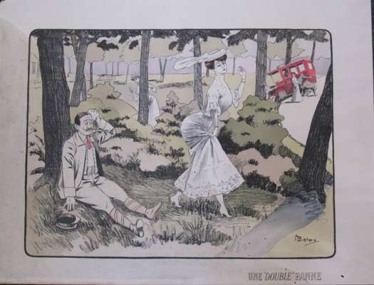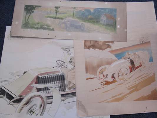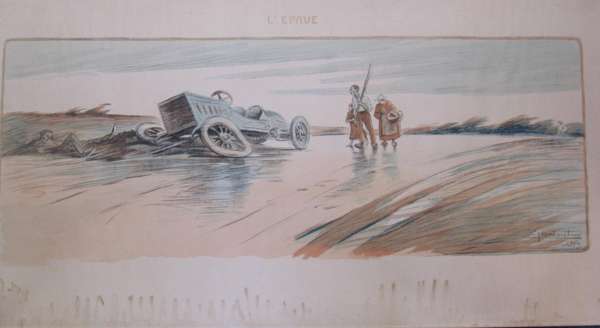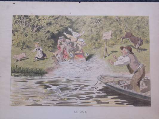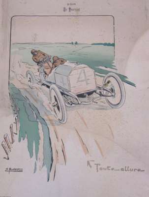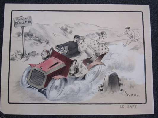 A Dourdain. Lanfranchi sur motocyclette "Peugeot". Paris: Montaut, 1904, 44 x 88cm; Montaut, E. L'epave. Paris: Montaut, 1904. 44 x 89cm; Montaut, Ernest Chauffeuse. Paris: N. Delmasure Fils, [c.1905]; Montaut, E. La coupe en tournant. A toute allure. Paris: Glaine, 1903; 56 x 66cm.; Meunier, George Bloqués. Paris: E. Sagot, [c.1900], 41 x 58cm.; Meunier, George Le gué. Paris: E. Sagot, [c.1900]; Guyp, F.R. [Racing car], no. 4/100, 27 x 71cm.; Laparra, William Le renseignement. Paris: l'Estampe Sportive Artistique, 1906, 51 x 55cm.; Armengol Le rapt. [Paris, c.1905] 52 x 70cm., hand-coloured lithographed posters; and an original watercolour of a lady motorist before an early car, [c.1910], indistinguishable signature, mounted on board, 64 x 49cm., some spotting; and 9 other early motoring posters in poor condition, [worming, tears and staining] (19)