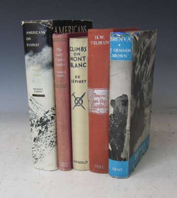 Lonsdale Library XVIII, Mountaineering. London, [no date]. 8vo, original cloth, dustwrapper; Alpine Club Peaks, passes and glaciers, a series of excursions by members of the Alpine Club. London, 1859. 8vo, colour frontispiece, folding plates and maps, original orange cloth gilt, interior clean; Ruttledge, Hugh Everest 1933. London, 1934. 8vo, frontispiece, plates, original blue cloth gilt, neat ink inscription to front endpaper; Yeld, George Scrambles in the Eastern Graians 1878-1897. London, 1900. 8vo, frontispiece, plates, original cloth gilt, faded, foxing; Ruttledge, Hugh Everest: the unfinished adventure. London, 1937. 8vo, signed by Charles Warren, cut signature of author loose, original blue cloth gilt, a good copy; Zsigmondy, Emil In the high mountains. Glasgow, 1992. 8vo, number 123 of 300 copies, original red cloth gilt, a.e.g., a fine copy; Irving, R.L.G. The alps. London, 1939. 8vo, colour frontispiece, plates, original cloth, dustwrapper, small hole in front wrapper, chipped at edges; McCormick, A. D. The alps from end to end. Westminster, 1895. Second edition, 8vo, frontispiece, plate, original cloth gilt, foxing at edges; and 16 others (24)