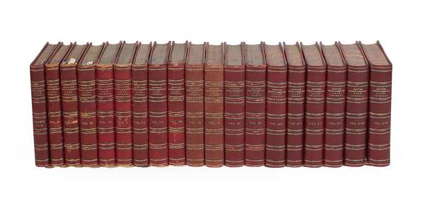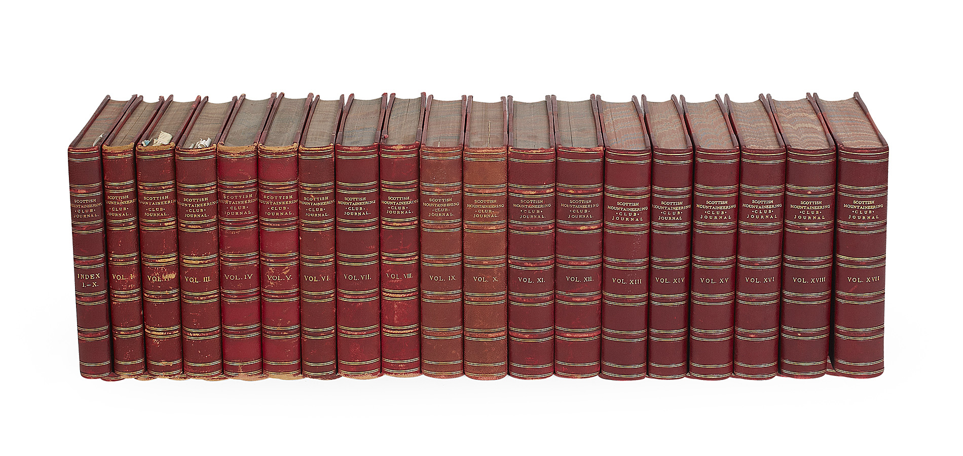 The Scottish Mountaineering Club journal. Edinburgh: Darien Press, 1891-2008. 8vo, 19 volumes [including index to volumes I-X], volumes I-XVIII bound in half red morocco gilt, some volumes rubbed, issues 109 (1930) -114 & 121 (1936) -158 (1964) bound in modern green cloth gilt, issues 159 (1968) to 199 (2008) in original blue wrappers, plus two index volumes for years 1910-35 & 1936-63 (qty)