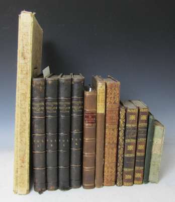 The baronial and ecclesiastical antiquities of Scotland. Edinburgh, [1848-52]. First edition, 4to, 4 volumes, contemporary half morocco gilt, rubbed at edges, some light spotting; Leighton, John Select views on the River Clyde. Glasgow, 1830. 4to, engravings, contemporary red morocco gilt, some fading to backstrip; Paul, Rev. William Past and present of Aberdeenshire. Aberdeen, 1881. 8vo, original green cloth gilt, bookplate; [Meek, Thomas] The new picture of Edinburgh. Edinburgh, [1812]. 8vo, frontispiece, folding map, original boards, hinges splitting; Cameron, Sir D.Y. - Cunninghame Graham, R.B. The district of Menteith. Stirling, 1930. Folio, one of 250 deluxe copies, signed etching by D.Y. Cameron, dustwrapper, original box; Wilson, John General view of the agriculture of Renfrewshire. Paisley, 1812. 8vo, folding colour map, uncoloured map, folding table, contemporary half calf gilt, rubbed; Somerville, Robert General view of the agriculture of East Lothian. London, 1805. 8vo, folding colour map, contemporary half calf gilt [uniform with previous], hinges splitting; and 3 others (13)