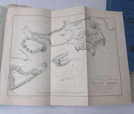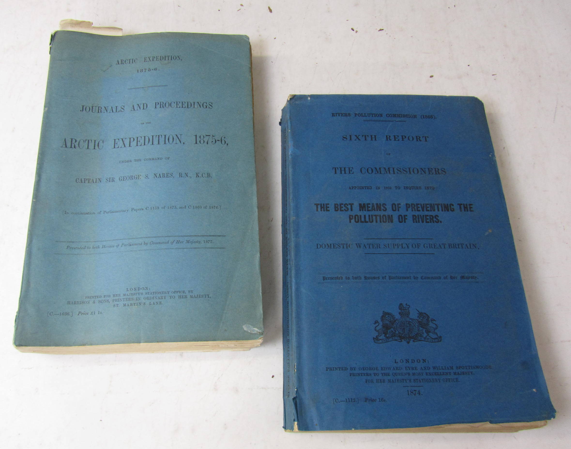 Journals and proceedings of the Arctic expedition, 1875-6. London: printed for HMSO, 1877. Folio, 32 maps and plates [as called for], original blue wrappers, section lacking from head of backstrip, small stain and some fading to upper wrapper; Rivers Pollution Commission Sixth report of the commissioners appointed in 1868 to inquire into the best means of preventing the pollution of rivers... London, 1874. Folio, 13 maps and plates, original blue wrappers, chipped at edges (2)