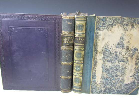 Modern Athens, displayed in a series of views of Edinburgh in the Nineteenth century. London: Jones & Co., 1829. 4to, engraved title and 48 plates, bound with 40 plates from "Noblemen and Gentlemen's Seats", contemporary half calf, gilt, a clean copy; Idem Modern Athens. London: Jones, 1829. 4to, engraved title and 48 plates, bound with 40 plates from "Noblemen's and Gentlemen's Seats", tissue guards, with printed title, contemporary purple morocco, spine gilt; and 8 others, mostly on Scotland (10)