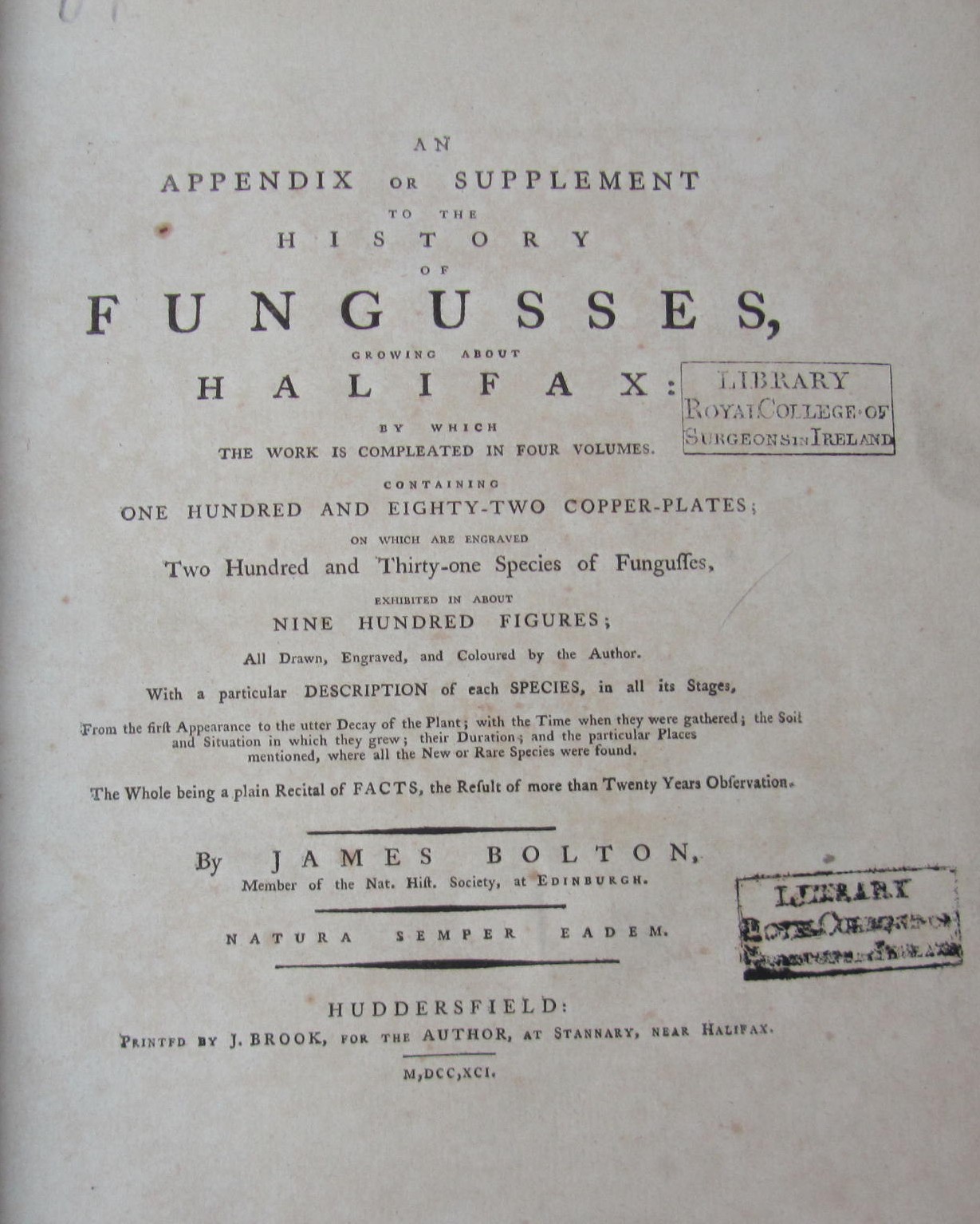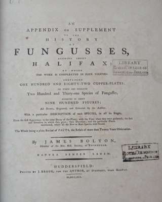 An history of fungusses, growing about Halifax. Halifax [Huddersfield]: for the Author, 1788-91. 4 volumes including Supplement, 4to, engraved frontispiece and 182 uncoloured engraved plates, nineteenth century half calf, rather spotted, some browning in volume 3, rubbed, library stamp to titles and a few text leaves