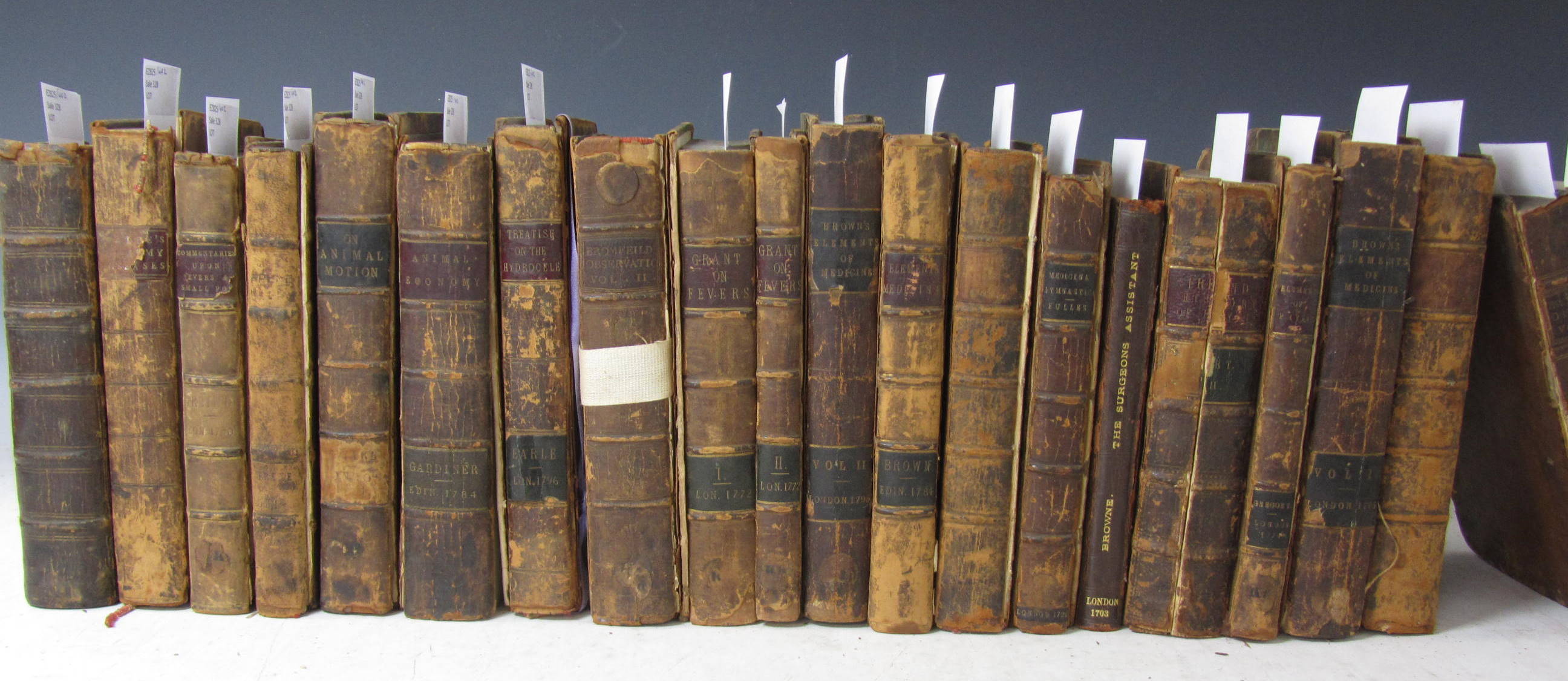 The elements of surgery. 1746. 8vo, 24 folding plates; Sharp, Samuel A treatise on the operations of surgery. 1751. 8vo, 14 engraved plates; Salmon, William Ars anatomica, or the anatomy of humane bodies. 1714. 8vo, engraved portrait & 29 plates; Fordyce, G. A treatise on the digestion of food. 1791. 8vo, slight dampstaining; Le Dran The operations in surgery. 1749; Bromfield, William Chirurgical observations and cases. 1773. 2 volumes, 8vo, folding plates; Brown, John The elements of medicine. 1795. 2 volumes, 8vo; Brocklesby, Richard Oeconimical and medical observations. 1764. 8vo; Fuller, Thomas Pharmacopoeia extemporanea. 1730. 8vo; Gataker, Thomas Essays on medical subjects. 1764, 8vo; Gardiner, John Observations on the animal oeconomy. 1784, 8vo; Garengeot, J.C. A treatise of chirurgical operations. 1723. 8vo; Farr, Samuel A philosophical enquiry into the nature, origin and extent of animal motion. 1771. 8vo; Friend, John Nine commentaries upon fevers. 1730; Fuller, Francis Medicine gymnastica. 1728; Earle, James A treatise on the hydrocele. 1796; Falconer, William An essay on the Bath waters. 1772. 8vo; Ring, John Reflections on the Surgeons' bill. 1798. 8vo; Letters and essays on the small-pox. 1778. 8vo, textblock split, Reide, Thomas D. A view of the diseases of the army. 1793. 8vo; Renny, G. A treatise on the venereal disease. 1782; Richter, August G. Medical and surgical observations. Edinburgh, 1794. 8vo; Lempriere, William Practical observations on the diseases of the army in Jamaica. 1799. 2 volumes, 8vo; Lemery, Nicholas A course of chymistry. 1720; Milman, Francis An enquiry into the source from whence the symptoms of the scurvy. 1782; Le Dran, H.F. A parallel of the different methods of extracting the stone out of the bladder. 1731; Milward, E. A letter to the Honourable Sir Hans Sloane. 1733; Pott, Percivall The chirurgical works. 1790. 3 volumes, 8vo, vol. 1 textblock split, strip lacking from head of title of vol.1; Lettsom, J.C. Medical memoirs. 1774. 8vo; Leslie, P. D. A philosophical inquiry into the cause of animal heat. 1788; Du Verney, G.J. A treatise of the organ of hearing. 1737. 12mo, folding plates, slight dampstaining; Hillary, William A rational and mechanical essay on the small-pox. 1735; Houston, Robert The history of ruptures. 1726. 8vo; Nesbitt, Robert Human osteogeny. 1736. 8vo, 6 folding engraved plates, binding defective; Beckett, William Practical surgery. 1740. 8vo, engraved frontispiece, title soiled; Gatti, Dr. New observations on inoculation. Dublin, 1758. 8vo; Houlston, Thomas Observations on poisons. 1787. 8vo; Irving, Ralph Experiments on the red and quill Peruvian bark. 1785; Hunter, John Observations on the diseases of the army in Jamaica. 1788; Home, Francis Medical facts and experiments. 1759. 8vo; Home, Everard Practical observations on the treatment of ulcers on the legs. 1797; Holland, Richard Observations on the small pox. 1747; Boulton, Richard A system of rational and practical chirurgery. 1713. 8vo, title soiled; most contemporary calf, library stamp on title, some spotting and soiling, most worn, many with cover or covers detached; and others, similar (quantity)