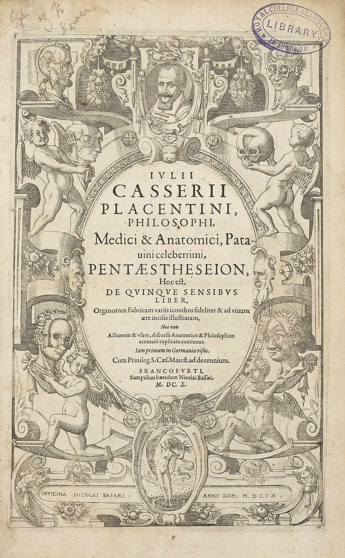 Pentaestheseion, hoc est, de quinque sensibus liber. Frankfurt: Nicolas Bassae, 1610. Folio, [6] l., 354, [8] l., engraved title and 33 engraved plates, contemporary vellum, library stamp to title, occasional slight browning, a few leaves slightly dampstained