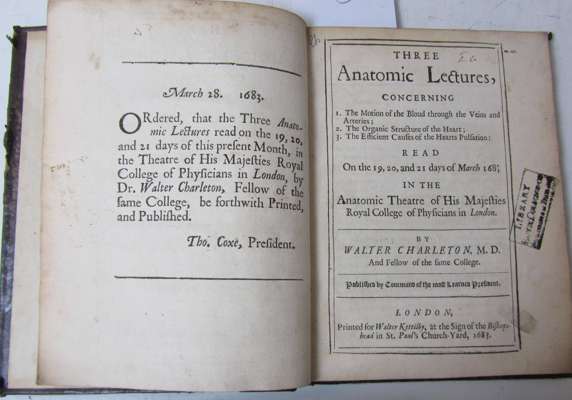 Three anatomic lectures. London: Walter Kittilby, 1683. 4to, [vi], 105, [vi] license leaf before title, advertisement leaf at end, 2 folding plates, twentieth century half calf, library stamp on title, slightly spotted