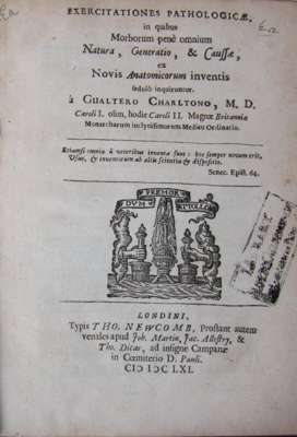 Exercitationes pathologicae. London: T. Newcomb, J. Martin, J. Allestry & T. Dicas, 1661. First edition, 4to, [xxiv], 208, contemporary calf, half-title, contemporary ink inscription of Thomas Molyneaux, library stamp on title, covers detached