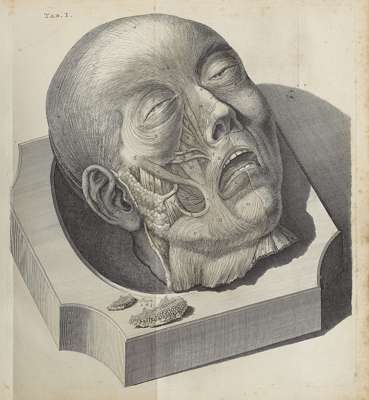 Icones musculorum capitis. Leiden: Typographia Dammeana, 1743. First edition, 4to, [2] l., 84, [iv]; 8 folding engraved plates, contemporary half calf, library stamp to title only, slightly spotted, rubbed, upper joint splitting