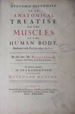 Myotomia reformata or an anatomical treatise on the muscles of the human body. London: for Robert Knaplock, 1724. Folio, frontispiece, title in red and black, table, 65 [of 67] plates, plate XIII in two states, lacking plates XVIII & XIX, later half morocco, worn, some staining and foxing, pencil scribbles to some borders, some tearing to plate edges, library stamps; [Idem] The anatomy of humane bodies... Oxford & London, 1698. First edition, folio, engraved title, vignette title, engraved plates [some folding], lacking frontispiece and plates, contemporary blind-stamped calf, worn, boards loose, some foxing and dustmarking, library stamps to main title and some plates (2)