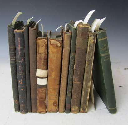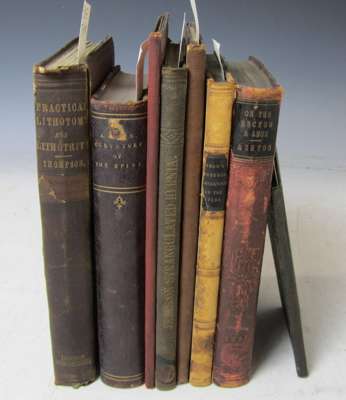 Illustrations of acoustic surgery. 1825. 8vo, half calf, board detached; Curtis, J.H. A treatise on the physiology and diseases of the ear. 1826. 8vo, frontispiece, original boards, worn; Saunders, J.C. The Anatomy of the human ear. 1829. 8vo, 4 hand-coloured folding plates; Tod, DavidThe anatomy and physiology of the organ of hearing. 1832. 2 works in one volume, half calf; Dieffenbach, J.F. Memoir on the radical cure of stuttering. 1841. 8vo, frontispiece, original cloth; Harvey, W. On the treatment of deafness. 1851. 8vo, original cloth; Hunt, James A treatise on the cure of stammering. 1854. 8vo, frontispiece, original cloth; Yearsley, J. Throat ailments. 1859. 8vo, 3 plates, original cloth; Mason, F. On harelip and cleft palate. 1877; d'Olivet, F. Notions sur le sens de l'ouie. Montpellier, 1819. 8vo, wrappers, one detached; Itard, J.M.G. Traité des maladies de l'oreille. Paris, 1821. 2 volumes, 8vo, half calf, two covers detached; and a quantity of similar books (quantity)