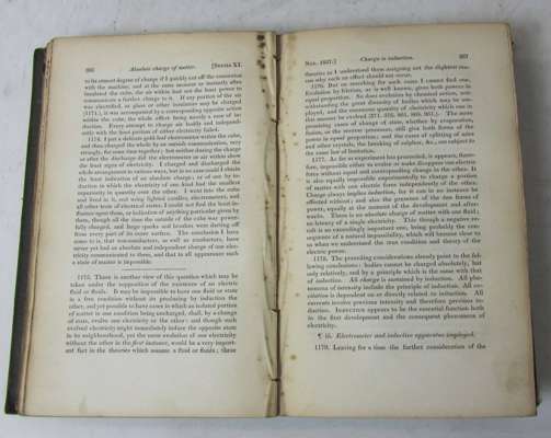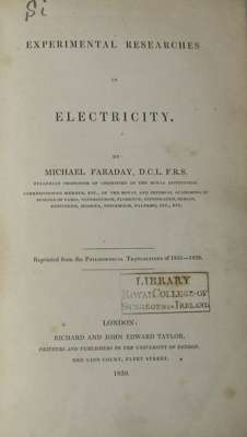 Experimental researches in electricity. London: R. & J.E. Taylor, 1839. First edition, 8vo, original cloth, library stamp on title and in text, 8 folding plates, some discolouration and spotting, binding rubbed and soiled, hinges weak