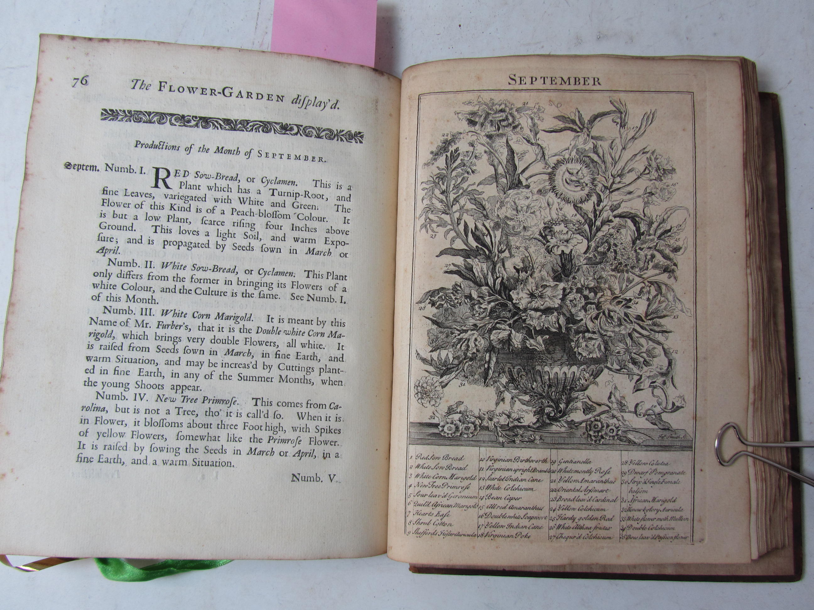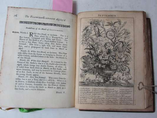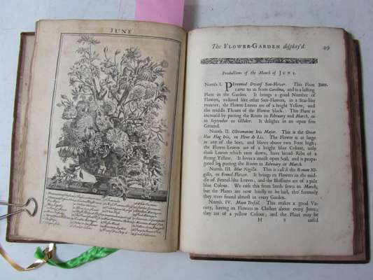 The flower-garden display'd. London: R. Montagu, 1734. Second edition, 4to, engraved frontispiece and 12 uncoloured plates, title printed in red and black, contemporary calf, some spotting and slight discolouration, worn, covers detached