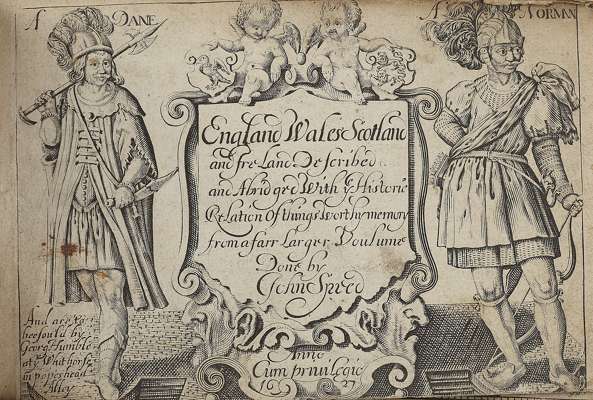 England, Wales, Scotland and Ireland described and abridged with ye historic relation of things. London : and are to bee sould at Georg Humble at the White-horse in popeshead Alley, 1627 . Part 1 of 2 only, [lacking "A Prospect of the World"], oblong 8vo (95 x 150mm.), engraved title (cropped at foot), engraved table of maps, 63 engraved regional and county maps by Pieter van den Keere, many reduced from Speed's folio atlas including folding map of Great Britain, Gloucestershire cropped at foot, original vellum, ties, one or two maps shaved close to neatline, a few very minor spots, one tie lacking, ?lacking A4-5
