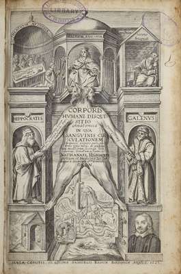 Corporis humani disquisitio anatomica. The Hague: Samuel Brown, 1651. First edition, 4to, title red and black, additional engraved title, 18 numbered anatomical engravings (of which number 12 is a plate not included in the pagination), woodcut headpiece and initials, contemporary limp vellum, preliminary pages slightly frayed, some browning and dampstaining, binding slightly warped, library stamps to engraved and printed title, K4 with loss of 1/2 of fore-margin not affecting text