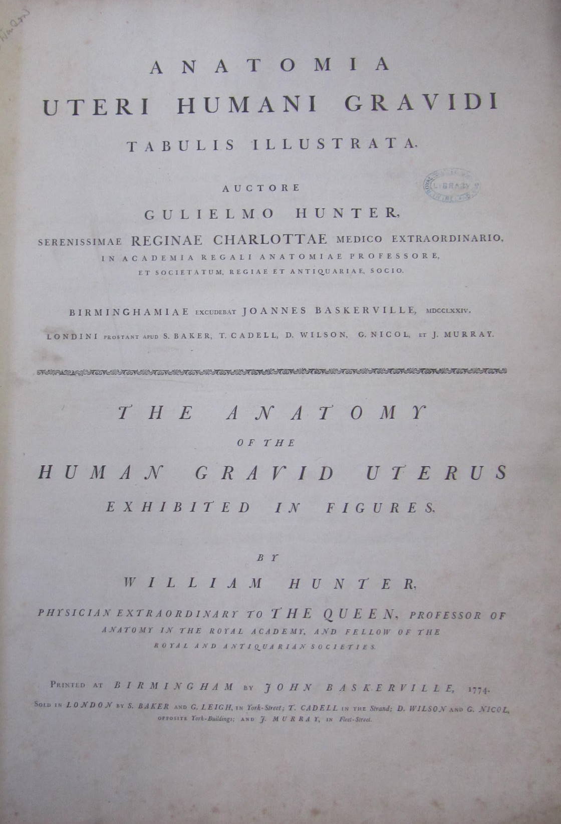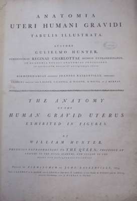 The anatomy of the human gravid uterus exhibited in figures. Birmingham: John Baskerville, 1774. Double folio, 32 [of 34] plates, lacking plates XXI & XXII, contemporary half calf, red morocco label to upper board, boards loose, library stamps