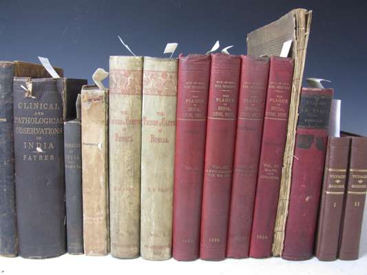 On mycetoma or the fungus disease of India. 1874. 4to, 11 chromolithographed plates, original cloth, spine worn; Tytler, Robert Remarks upon morbus oryzeus, or disease occasioned by the employment of noxious rice as good. Calcutta, for the author, 1820. 8vo, 4pp. errata, contemporary half calf, title laid down; Annesley, James Sketches of the most prevalent diseases of India. 1825. 8vo, 3 coloured plates, folding map, half calf, covers detached, lacks spine; Risley, H.H. The tribes and castes of Bengal. Anthropometric data. Calcutta, 1891. 2 volumes, 8vo, contemporary vellum, soiled; Government of India, Home DepartmentThe plague in India, 1896, 1897. Simla, 1898. 4 volumes, 8vo, folding charts and plans, original cloth, somewhat soiled; Horsfield, Thomas Part I of a descriptive catalogue of the lepidopterous insects. 1828. 4to, 2 (of 4) plates, one coloured, original wrappers, detached, worn; Morehead, C. Clinical researches on disease in India. 1860. 8vo, half calf; Pennant, T. India Zoology. 1790. 4to, engraved title and plates, calf, spotting, worn, cover detached; ; and c.8 others, similar (19)