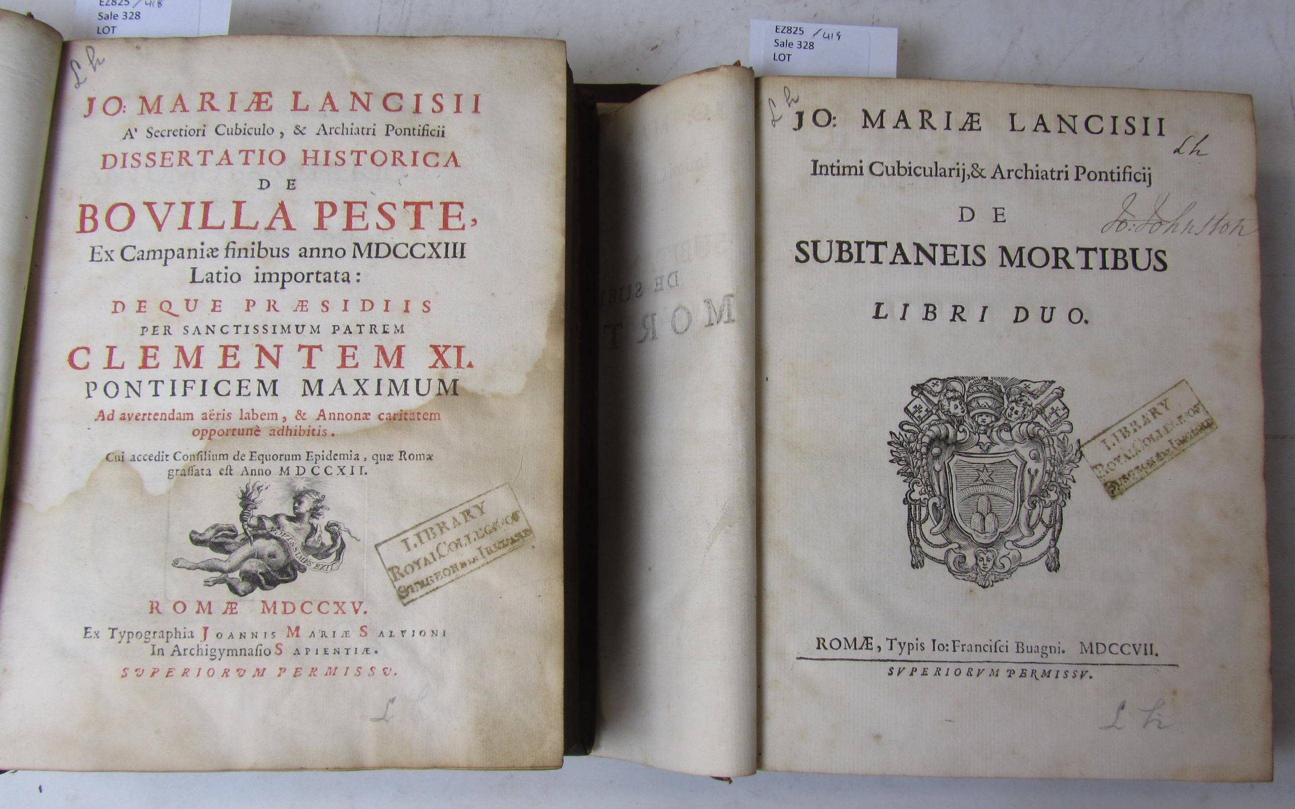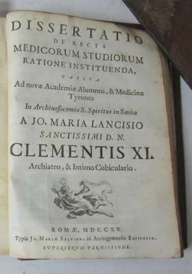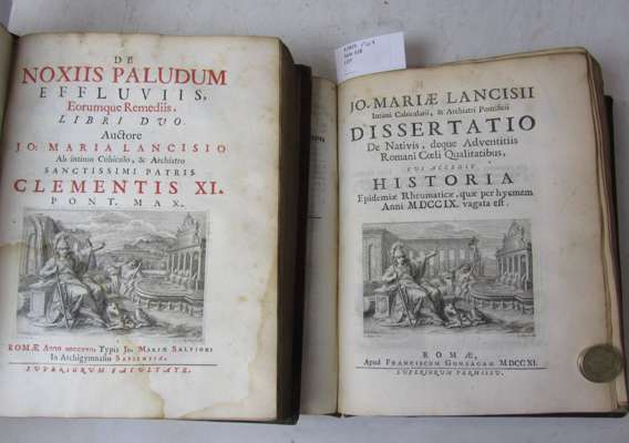 De subitaneis mortibus libri duo. Rome: J.F. Bugani, 1707. First edition, title in first state with woodcut Papal arms of Clement XI, 4to, half-title and initial blank, library stamp on title & two other leaves, slightly spotted; Idem Dissertatio de nativis, deque adventitiis Romani coeli qualitatibus. Rome: F. Gonzaga, 1711. 4to, title vignette, with final blank; Idem Dissertatio de recta medicorum studiorum ratione instituenda. Rome: J. M. Salvioni, 1715. 4to, title vignette; Idem Dissertatio historica de bovilla peste. Rome: J.M. Salvoni, 1715. 4to, title printed in red and black and with engraved vignette, dampstained; Idem De noxiis paludum effluviis. Rome: J.M. Salvioni, 1717. 4to, title printed in red and black and with engraved vignette, half-title, dampstained; 5 works bound in 2 volumes, contemporary calf, rebacked and repaired, two covers detached (2)