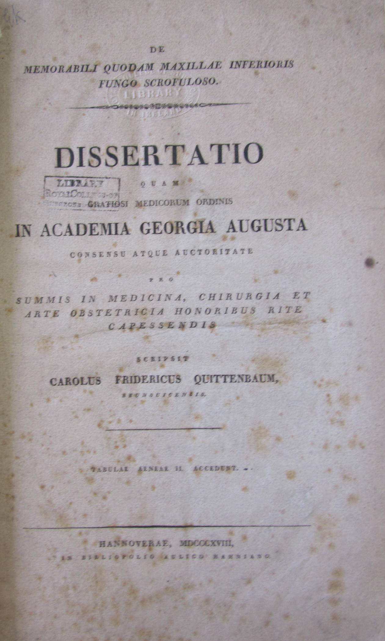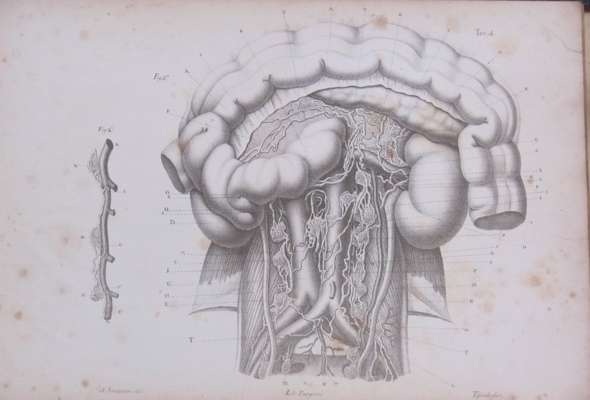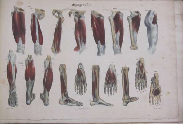 Tabulae Langenbeckii commentarium de structura peritonaei... [1817]. Folio, atlas volume only, 24 engraved plates, contemporary half calf, worn, heavy foxing and dustmarking, library stamps to titles; Quittenbaum, C. F. De memorabili quodam maxillae inferioris fungo scrofuluso. Hanover, 1818. Folio, 2 engraved plates, contemporary red calf, worn, foxing, library blind stamps; Sarlandière, J. Anatomie méthodique ou organographie humaine. Paris, 1829. Oblong folio, 14 hand-coloured lithographed plates, red half calf, some spotting, slightly rubbed; Lippi, R. Atlante anatomico zootomico. [c.1810], Oblong folio, 9 lithographed plates, red half calf, spotted, several marginal tears (4)