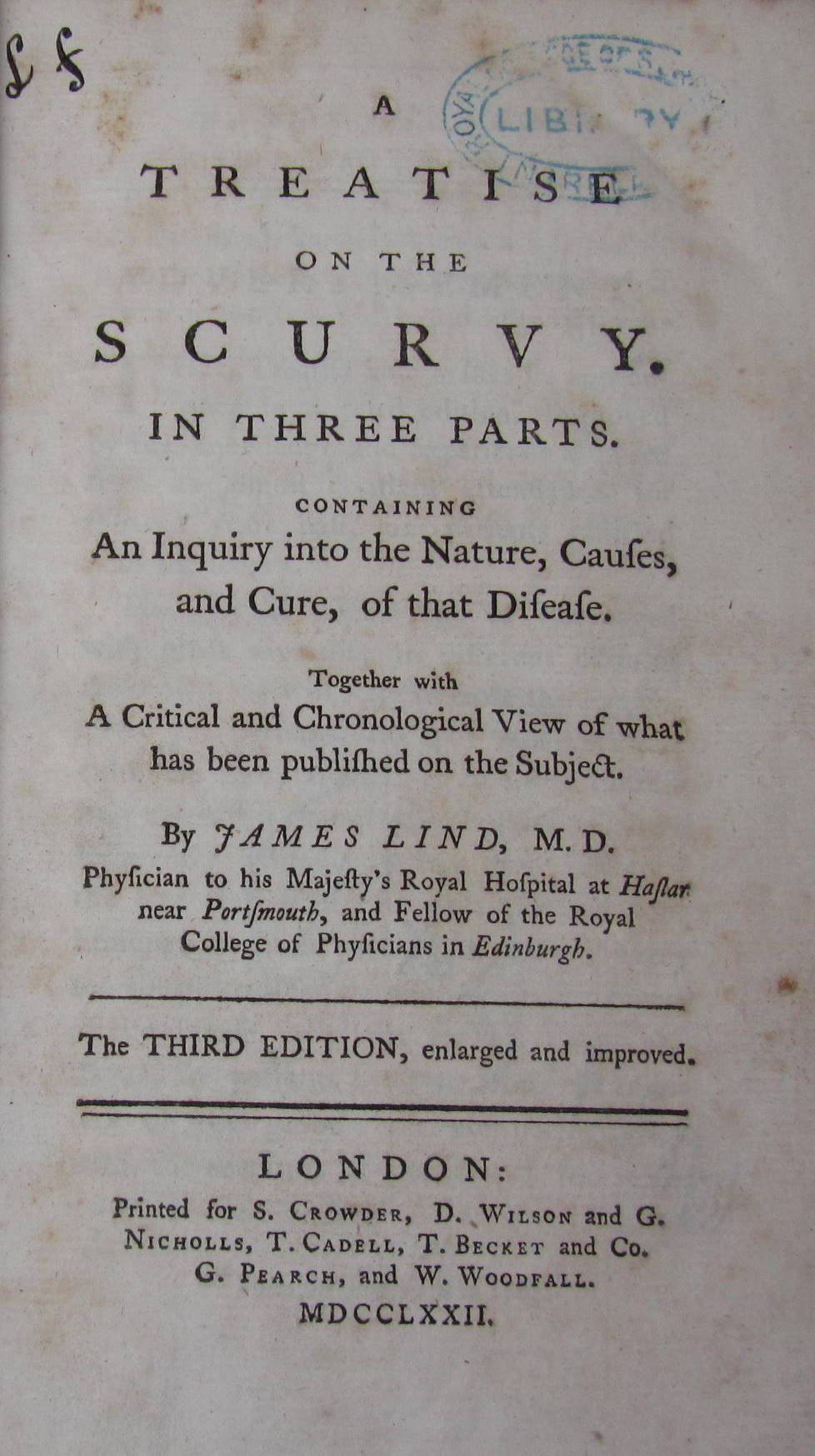 A treatise on the scurvy. London: S. Crowder &c., 1772. Third edition, 8vo, contemporary calf, slightly spotted, worn, library stamp to title-page