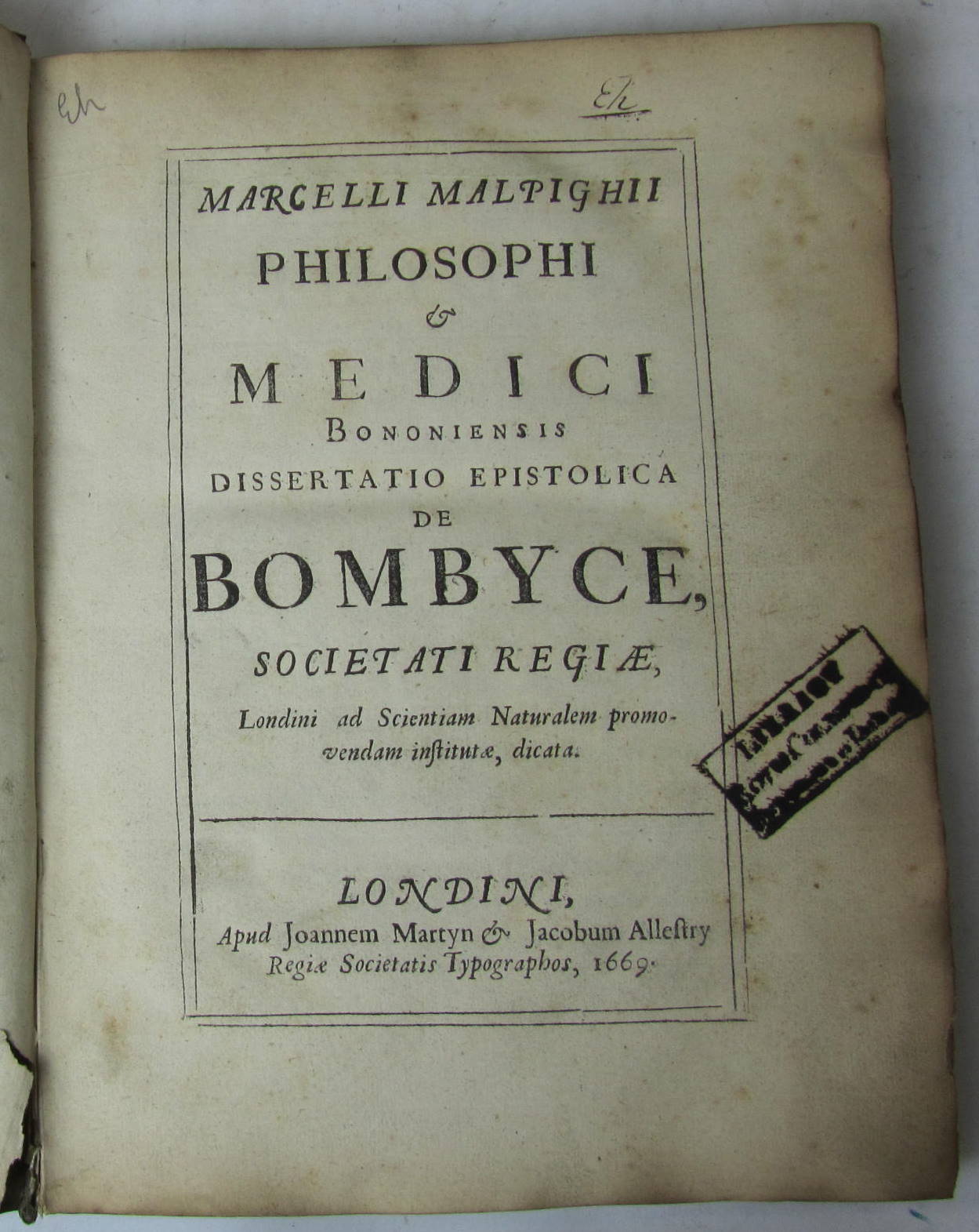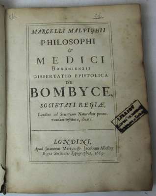 Disseratio epistolica de bombyce. London: J. Martyn & J. Allestree, 1669. First edition, 4to, [6] l (first blank), 100; 12 folding engraved plates, contemporary vellum, library stamp on title only, slightly spotted