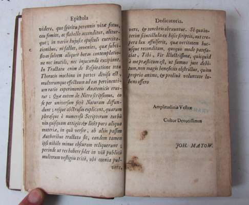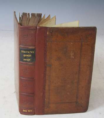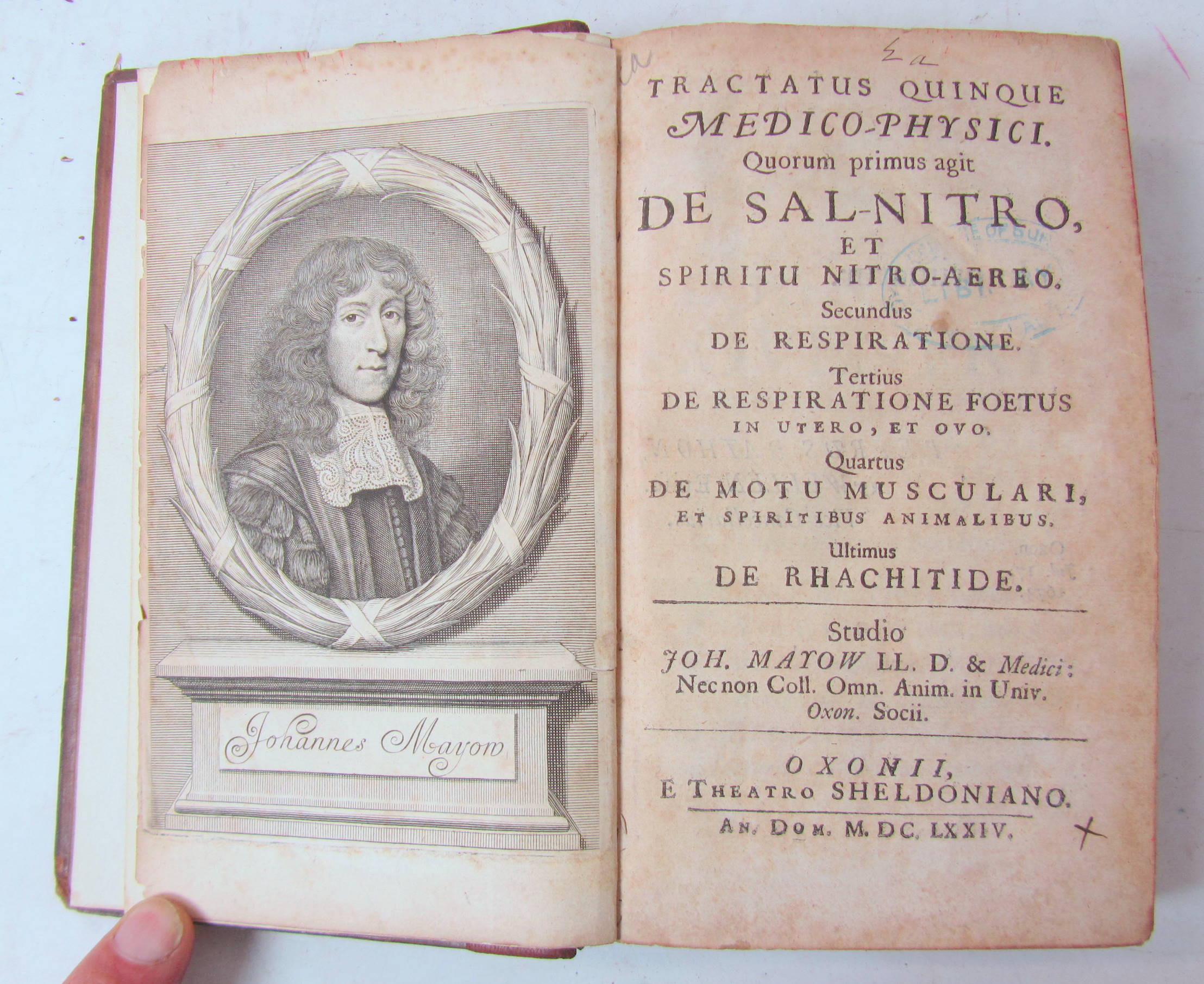 Tractatus quinque medico-physici. Oxford: Sheldonian Theatre, 1674. First edition, 8vo, [20] l., 335,152, engraved portrait and 6 folding plates, contemporary calf, library stamp to title and text, somewhat spotted, somewhat crudely rebacked, slight fraying to edge of portait, p. 189 torn with partial loss of two words