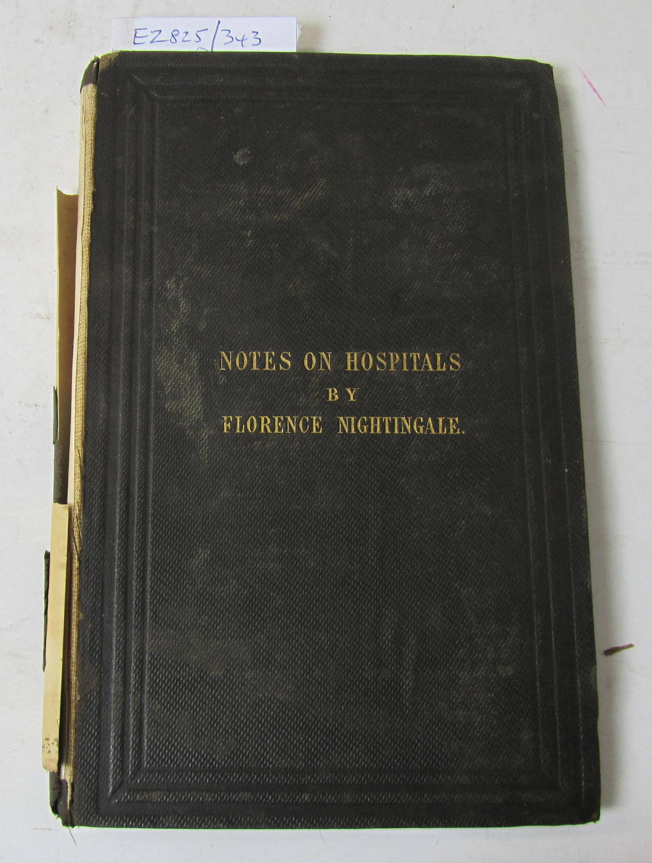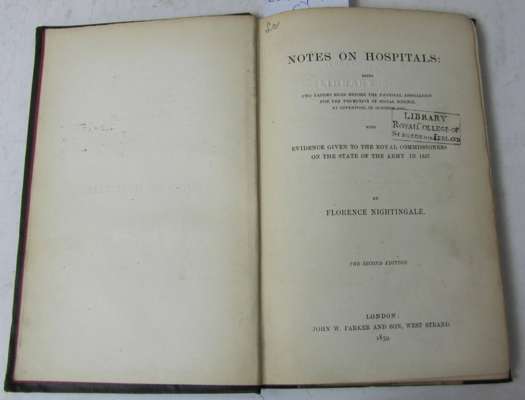 Notes on hospitals: being two papers. London: J.W. Parker, 1859. Second edition, 8vo, folding table and 4 folding plans, half-title, 8pp. advertisements at end, original cloth, one plan loose, library stamp on title, several blindstamps, lacking spine