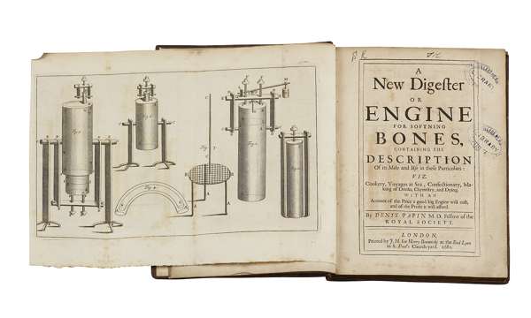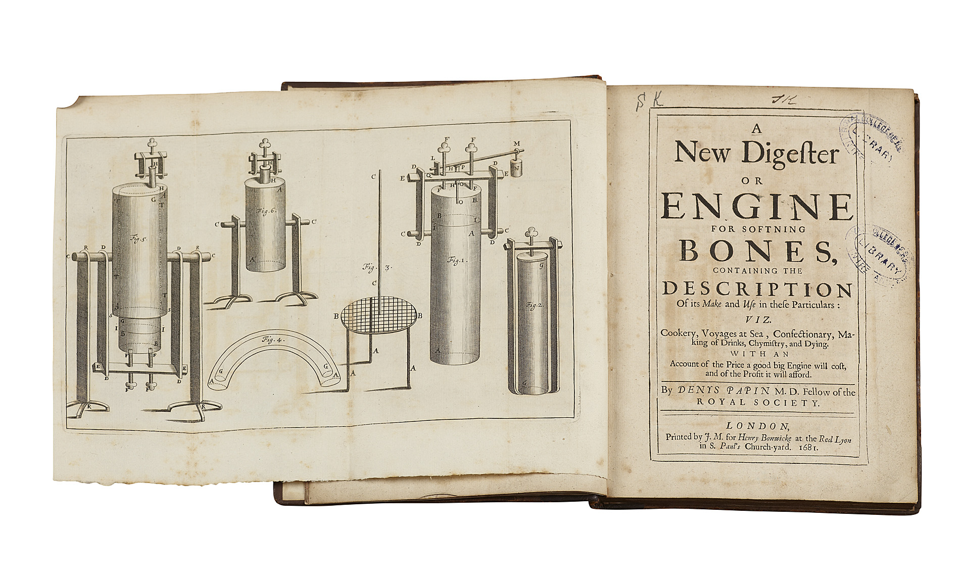 A new digester or engine for softning bones, containing the description of its make and use in these particulars... London: J.M. for Henry Bonwicke, 1681. 4to, folding frontispiece [bound with] A continuation of the new digester of bones. London: Joseph Streater, 1687, 2 folding engraved plates, some browning and spotting; two works in one volume, 4to, contemporary calf, rebacked and recornered, covers slightly rubbed, library stamps
