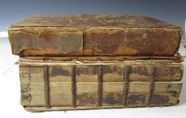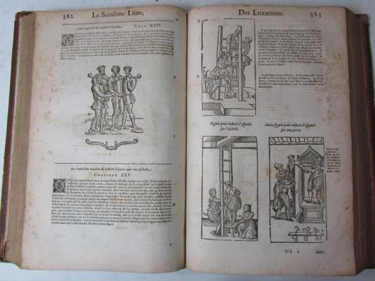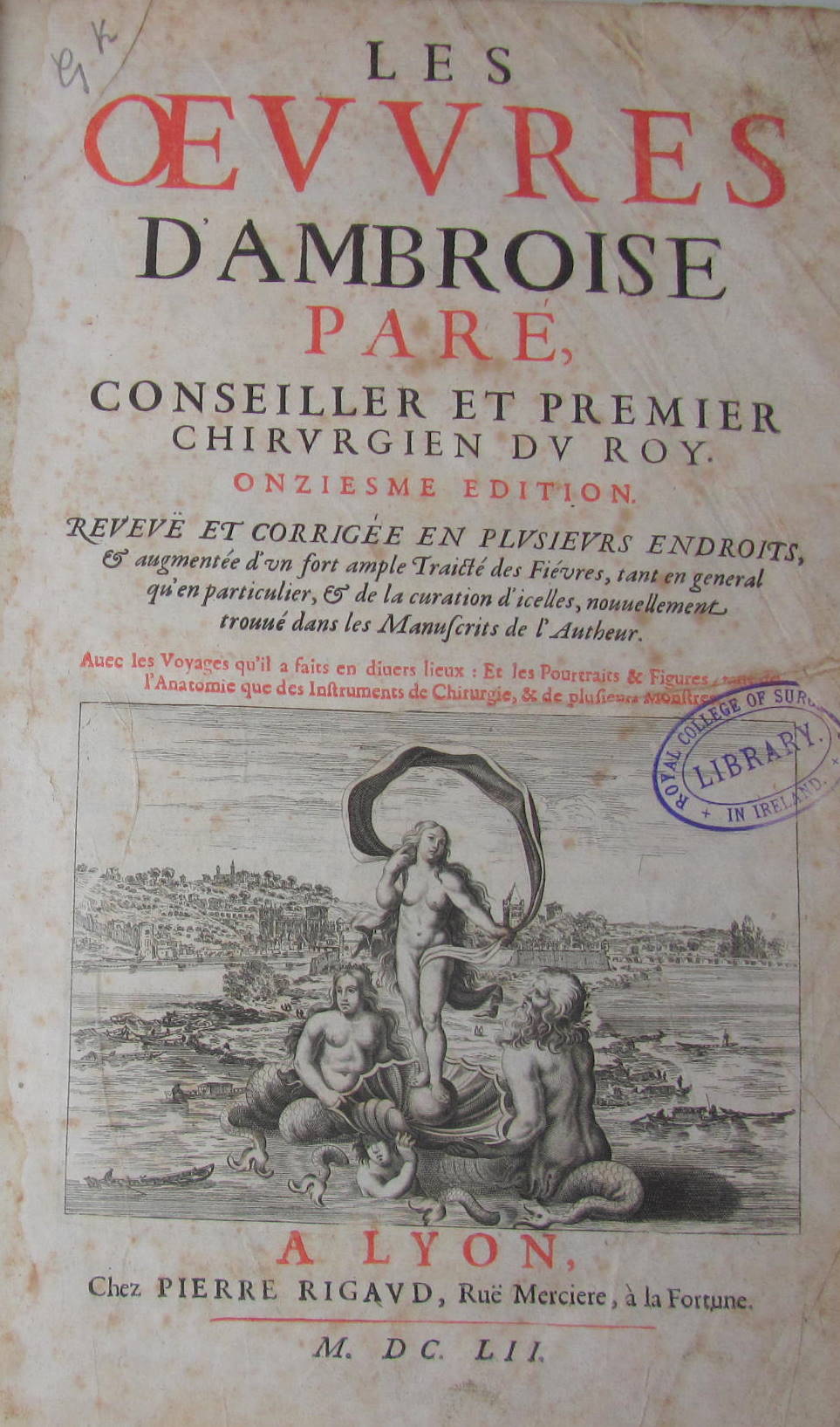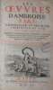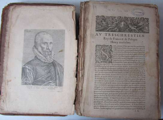 Les oeuvres. Lyon: Pierre Rigaud, 1652. Folio, eleventh edition, title printed in red and black with engraved vignette, half-title, numerous woodcuts, eighteenth century calf, lacking 1 text leaf and 1 blank leaf at end, title torn without loss, repairs to several index leaves, some spotting and dampstaining, library stamp to title and half-title, very worn; Idem [Les oeuvres] [Paris, 1628]. Folio, engraved portrait, woodcuts, leaf 1157/8 defective, numerous leaves detached, some spotting and staining, a few leaves wormed in lower margin, several leaves repaired, binding weak, covers detached, lacking spine (2)