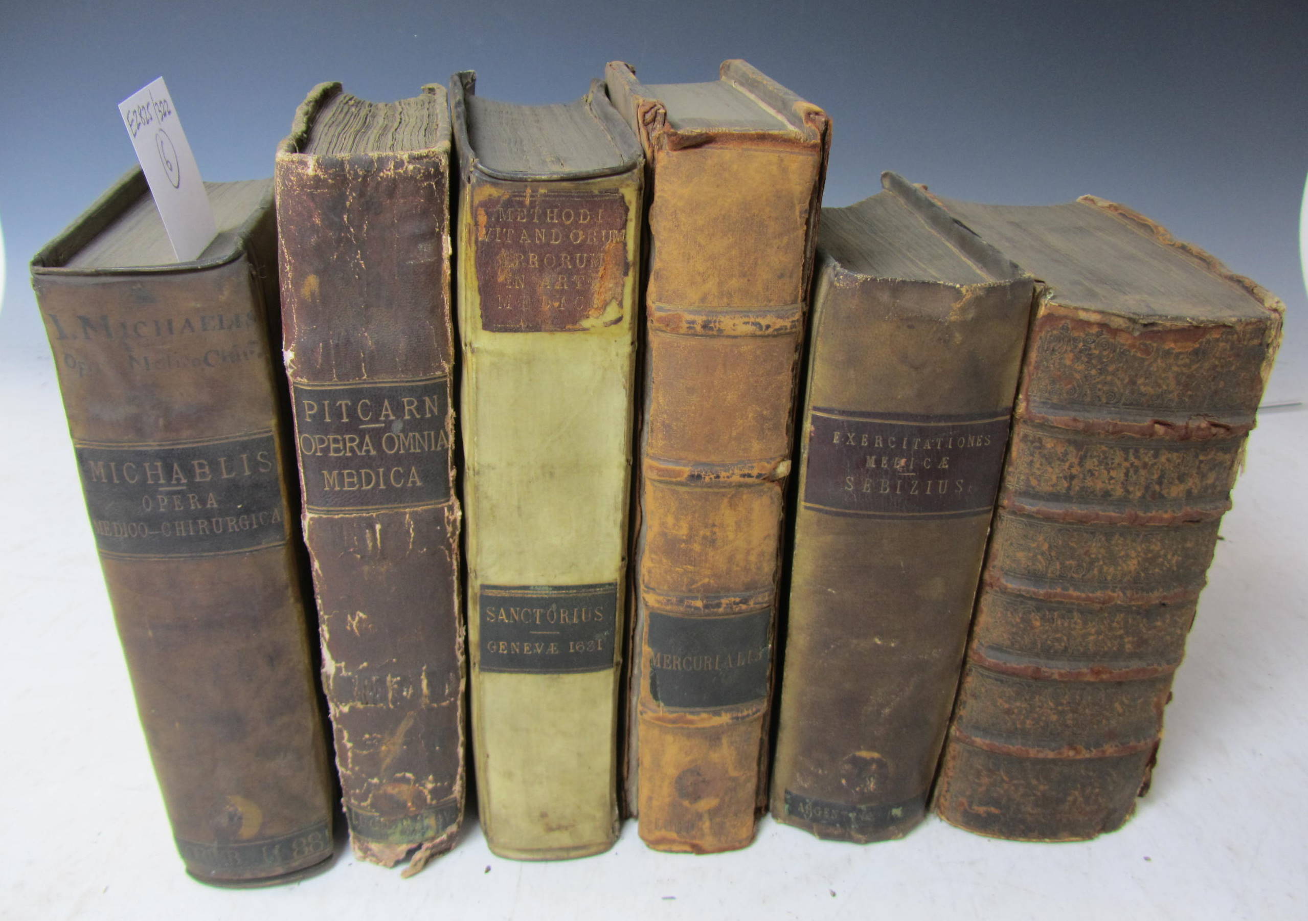 Methodi vitandorum errorum omnium qui in arte medica continguent. Geneva: P. Aubert, 1631. 4to, 2 parts in one volume, contemporary vellum, title slightly dusty; Sebisch, Melchior Exercitationes medicae. Strasbourg: J. Staedelius, 1672. 4to, title printed in red and black, 3 engraved plates, contemporary vellum, browning; Idem De alimentorum facultatibus. Strasbourg: J. P. Mulbius, 1650. 4to, engraved title, folding table, contemporary calf, some browning, worn; Mercuralis, D. Hieronymus Tractatus varii. Lyon: A. Pillehotte, 1623. 8vo, contemporary calf, title spotted, covers detached; Michaelis, J. Opera medico-chirurgica. Nuremberg: J. Hofmann, 1688. 4to, title printed in red and black, contemporary vellum, marginal discolouration, a few early leaves frayed in fore-margin; Pisonis, C. Selectiorum observationum et consiliorum. Leiden: G. Potvliet, 1733. 4to, contemporary calf, covers detached; Pitcairn, A. Opera omnia medica. Leiden: J.A. Langerak, 1737. 4to, contemporary quarter calf, uncut, some browning, rubbed; Idem Dissertationes medicae. Edinburgh: R. Freebairn, 1713. 4to, contemporary calf, worn, covers detached (8)